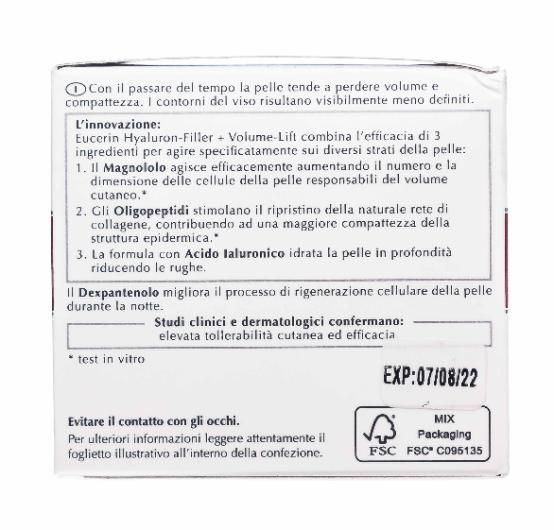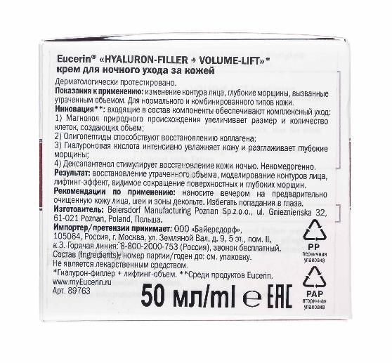 Ночной крем содержит три активных ингредиента, действие которых направлено на определенные слои кожи, в которых происходит потеря объема: магнолол увеличивает размер и количество создающих объем клеток 1, олигопептиды стимулируют коллагеновую сеть для придания структуре кожи дополнительной упругости 1, а гиалуроновая кислота интенсивно увлажняет кожу и разглаживает глубокие морщины. В него также входит декспантенол, который дополнительно способствует регенерации в ночное время. Регулярное использование крема для ночного ухода за кожей Eucerin HYALURON-FILLER + VOLUME-LIFT помогает восстановить потерянный объем и откорректировать контуры лица. Тонкие линии и глубокие морщины заметно уменьшаются, а кожа становится заметно более гладкой и упругой.