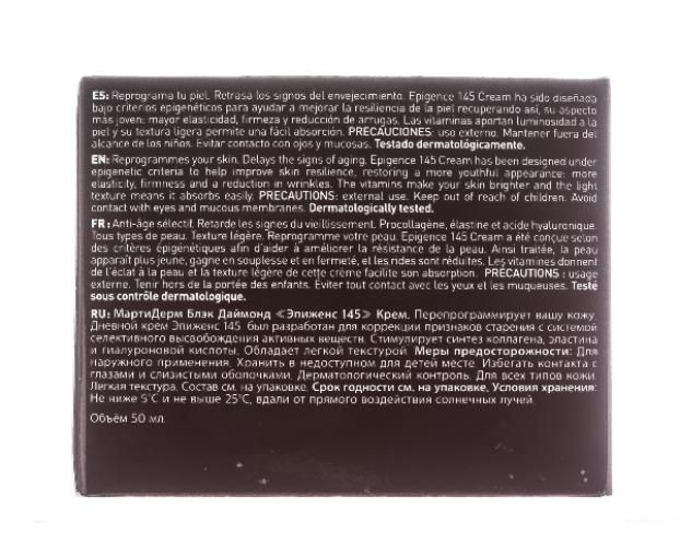 Антивозрастной крем, который борется со всеми признаками старения, используя знания эпигенетики и уникальную формулу. Дневной крем Martiderm Black Diamond Epigence 145 был разработан в соответствии с эпигенетическими критериями для улучшения упругости и устойчивости кожи, восстановления ее упругости и гладкости.