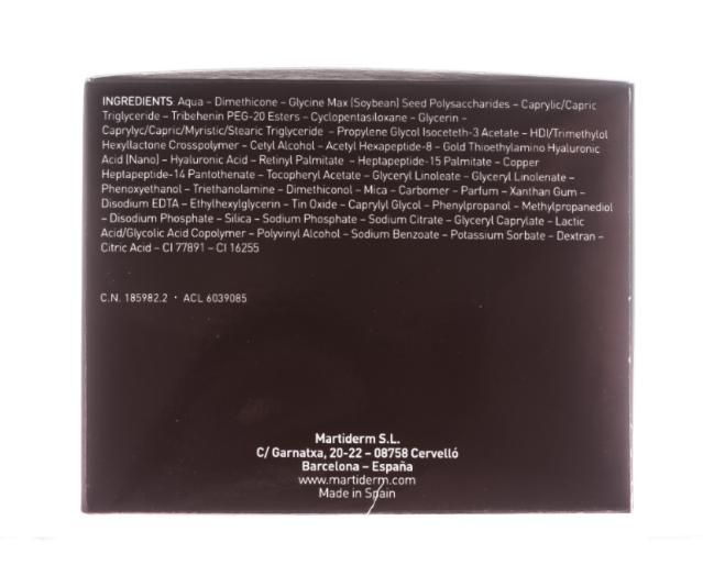 Aqua – Dimethicone – Glycine Max (Soybean) Seed Polysaccharides – Caprylic/Capric Triglyceride – Tribehenin PEG-20 Esters – Cyclopentasiloxane – Glycerin – Caprylyc/Capric/Myristic/Stearic Triglyceride – Propylene Glycol Isoceteth-3 Acetate – HDI/Trimethylol Hexyllactone Crosspolymer – Cetyl Alcohol – Acetyl Hexapeptide-8 – Gold Thioethylamino Hyaluronic Acid (Nano) – Hyaluronic Acid – Retinyl Palmitate – Heptapeptide-15 Palmitate – Copper Heptapeptide-14 Pantothenate – Tocopheryl Acetate – Glyceryl Linoleate – Glyceryl Linolenate – Phenoxyethanol – Triethanolamine – Dimethiconol – Mica – Carbomer – Parfum – Xanthan Gum – Disodium EDTA – Ethylhexylglycerin – Tin Oxide – Caprylyl Glycol – Phenylpropanol – Methylpropanediol – Disodium Phosphate – Silica – Sodium Phosphate – Sodium Citrate – Glyceryl Caprylate – Lactic Acid/Glycolic Acid Copolymer – Polyvinyl Alcohol – Sodium Benzoate – Potassium Sorbate – Dextran – Citric Acid – CI 77891 – CI 16255