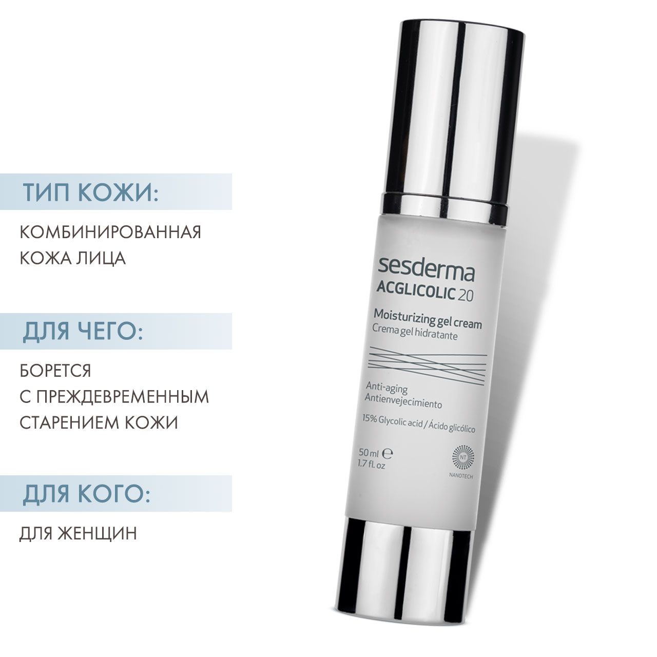 Увлажняющий крем-гель с гликолиевой кислотой, витаминами С, Е, алоэ вера, экстрактом гаммамелиса и стволовыми клетками синеголовника приморского борется с преждевременным старением кожи, обеспечивает ежедневное обновление и регенерацию клеток, может использоваться для подготовки к бритью или эпиляции.