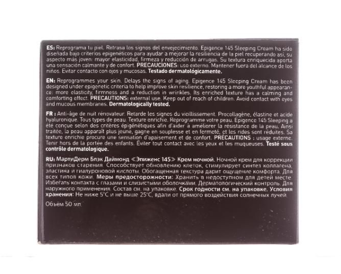 Антивозрастной крем, который борется со всеми признаками старения, используя знания эпигенетики и уникальную формулу. Ночной крем Martiderm Black Diamond Epigence 145 был разработан в соответствии с эпигенетическими критериями для улучшения упругости и устойчивости кожи, восстановления упругости и гладкости, которые она потеряла. Эластичность кожи восстанавливается, так как этот крем способен улучшить экспрессию эластина на 92,2%, что приводит к более упругой коже с измененными контурами лица.