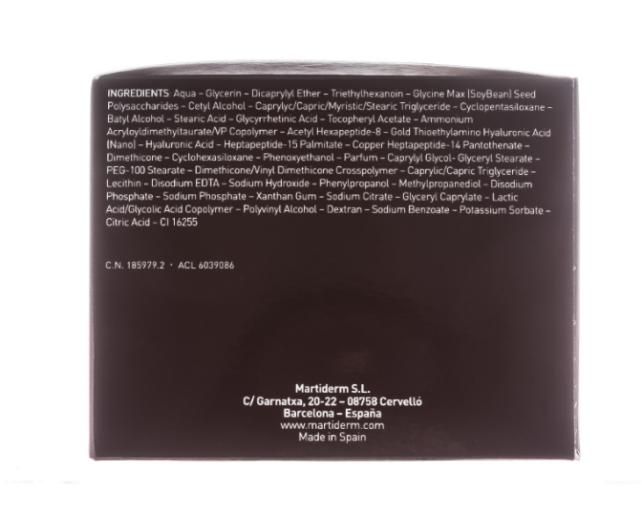 Aqua – Glycerin – Dicaprylyl Ether – Triethylhexanoin – Glycine Max (SoyBean) Seed Polysaccharides – Cetyl Alcohol – Caprylyc/Capric/Myristic/Stearic Triglyceride – Cyclopentasiloxane – Batyl Alcohol – Stearic Acid – Glycyrrhetinic Acid – Tocopheryl Acetate – Ammonium Acryloyldimethyltaurate/VP Copolymer – Acetyl Hexapeptide-8 – Gold Thioethylamino Hyaluronic Acid (Nano) – Hyaluronic Acid – Heptapeptide-15 Palmitate – Copper Heptapeptide-14 Pantothenate – Dimethicone – Cyclohexasiloxane – Phenoxyethanol – Parfum – Caprylyl Glycol- Glyceryl Stearate – PEG-100 Stearate – Dimethicone/Vinyl Dimethicone Crosspolymer – Caprylic/Capric Triglyceride – Lecithin – Disodium EDTA – Sodium Hydroxide – Phenylpropanol – Methylpropanediol – Disodium Phosphate – Sodium Phosphate – Xanthan Gum – Sodium Citrate – Glyceryl Caprylate – Lactic Acid/Glycolic Acid Copolymer – Polyvinyl Alcohol – Dextran – Sodium Benzoate – Potassium Sorbate – Citric Acid – CI 16255