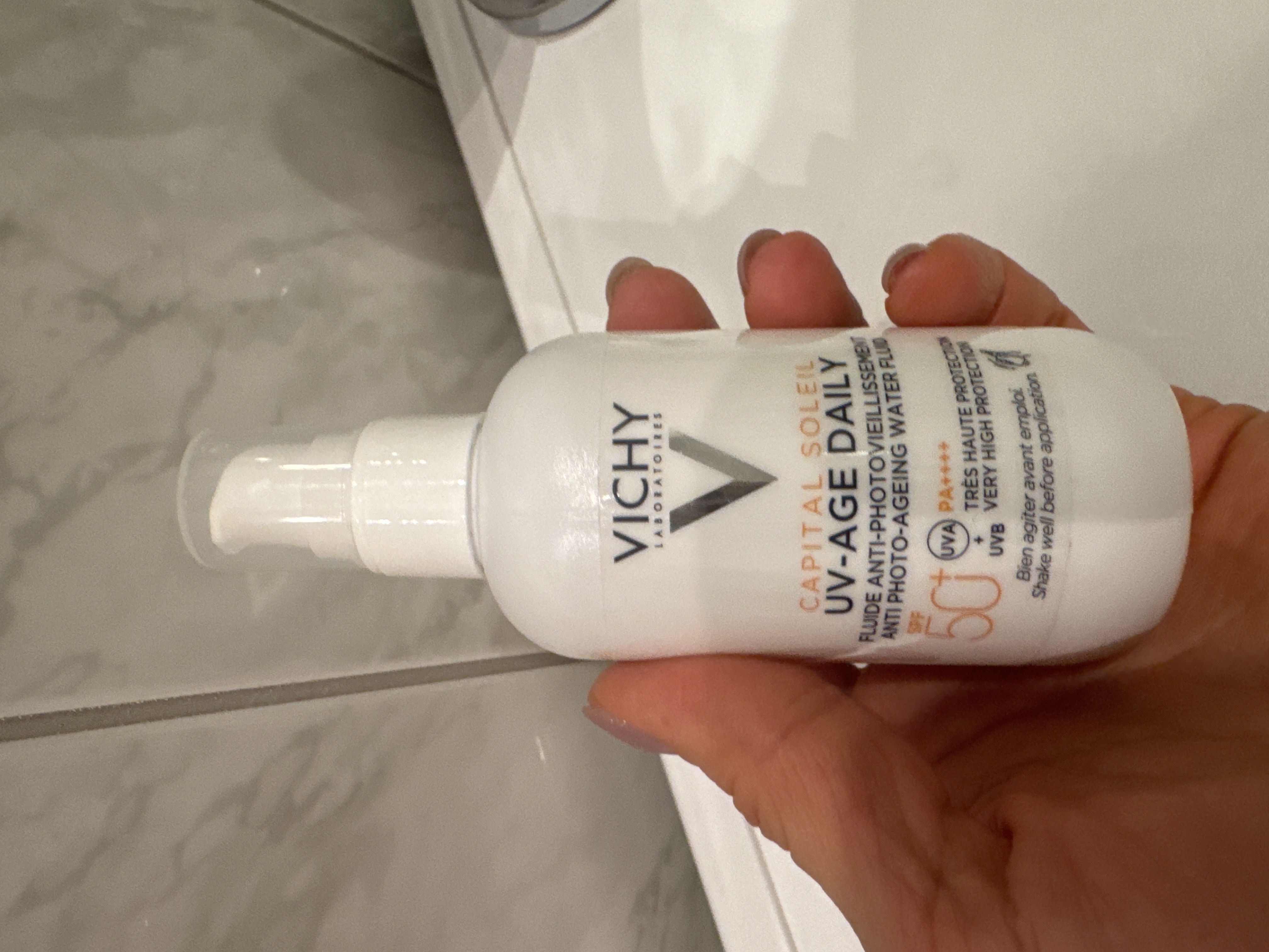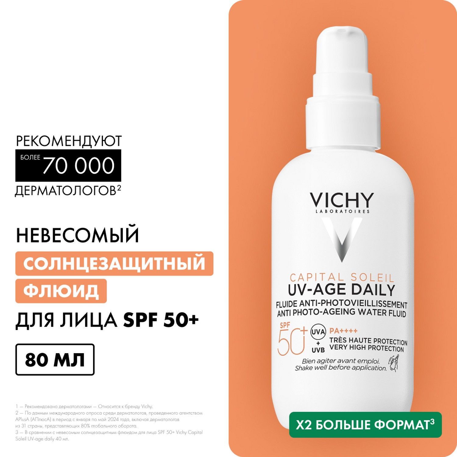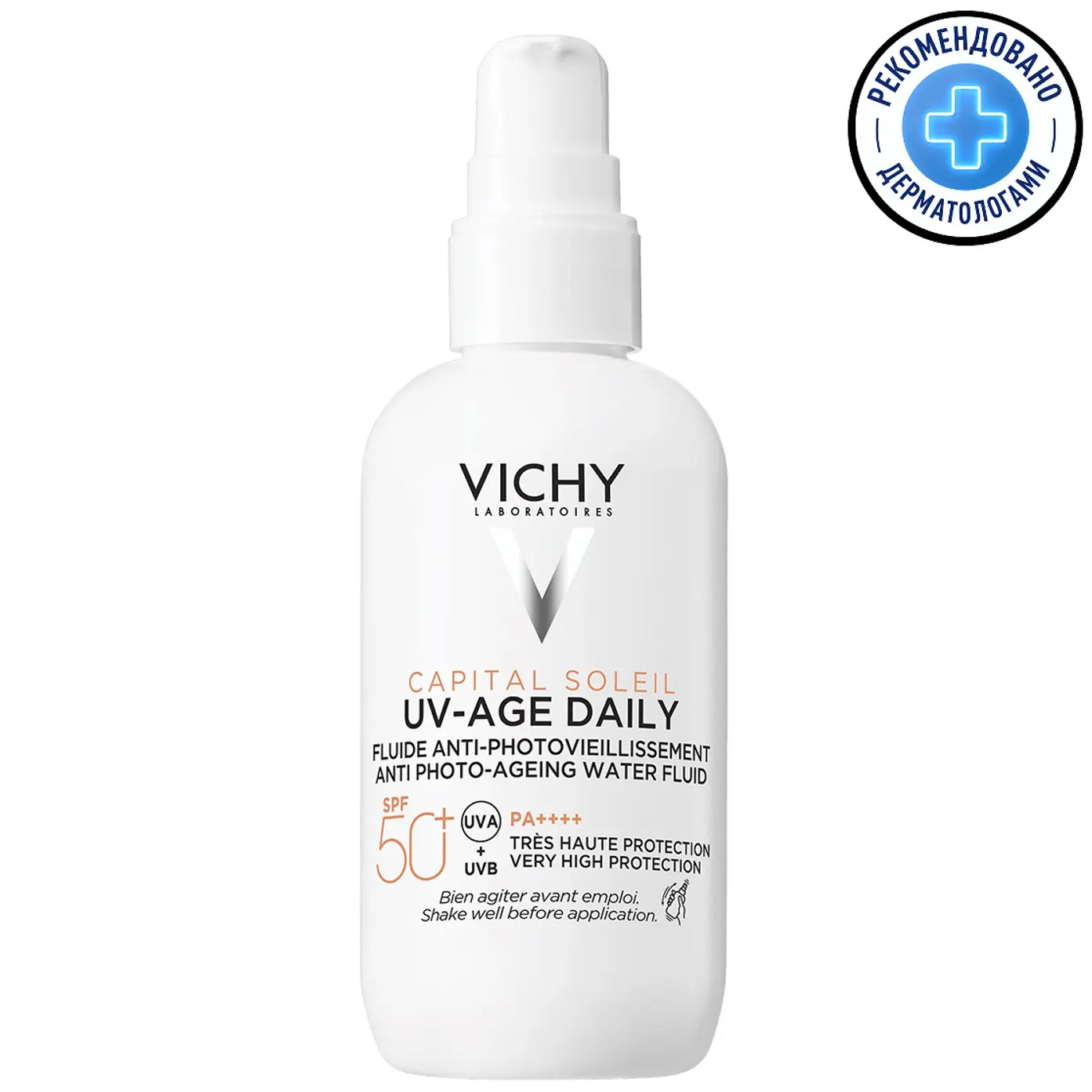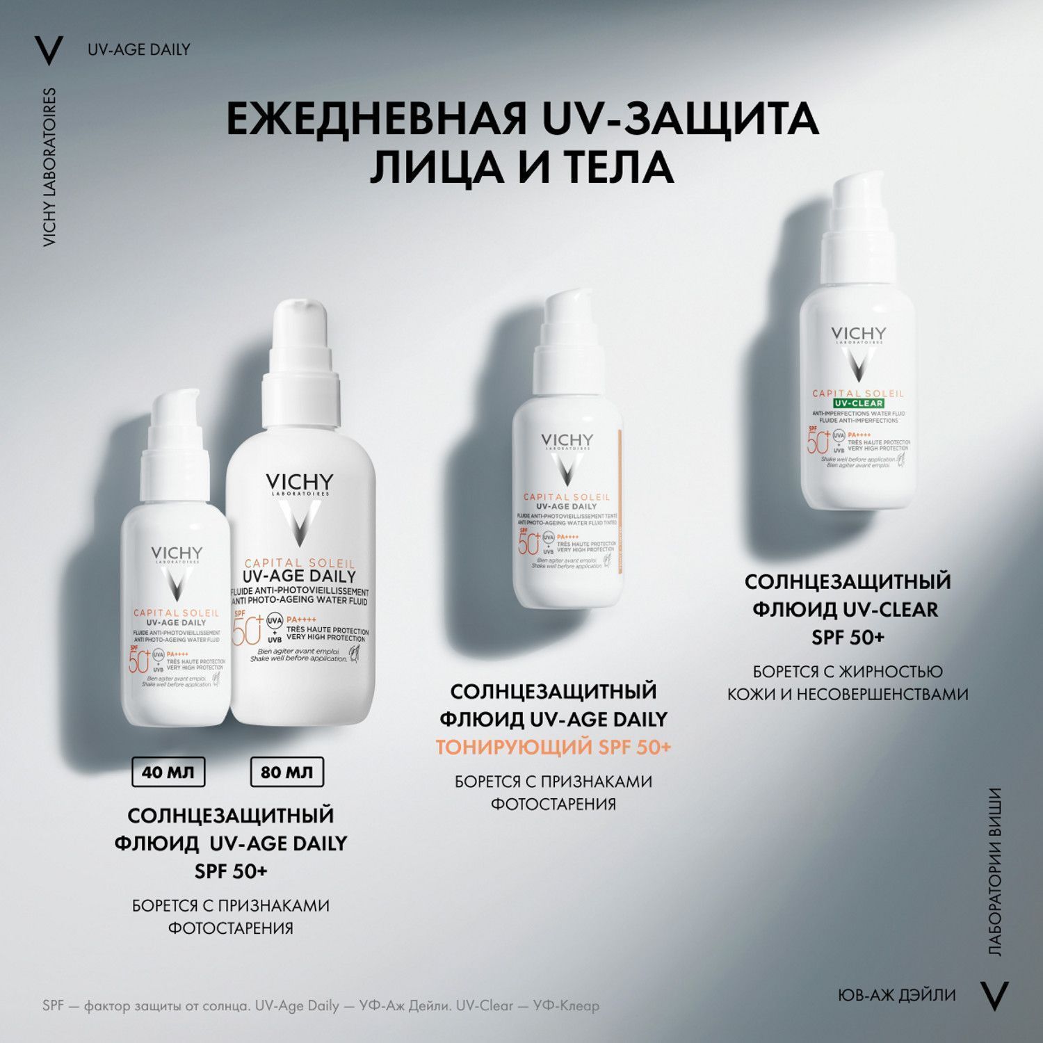 Невесомый солнцезащитный флюид UV-Age Daily обеспечивает очень высокую степень UVA- и UVB-защиты благодаря системе UV-фильтров SPF50+, PA++++ (UVA-PF 46).