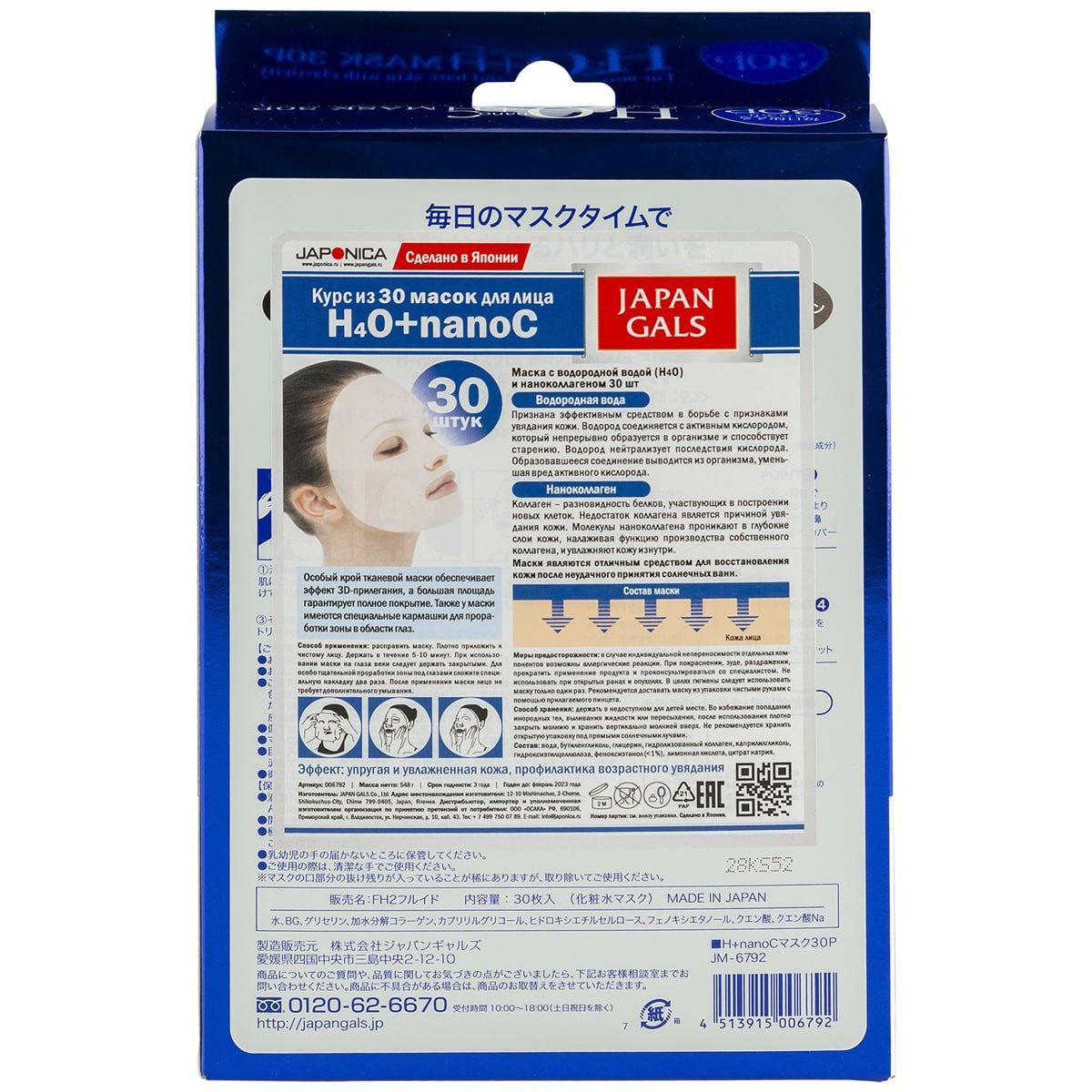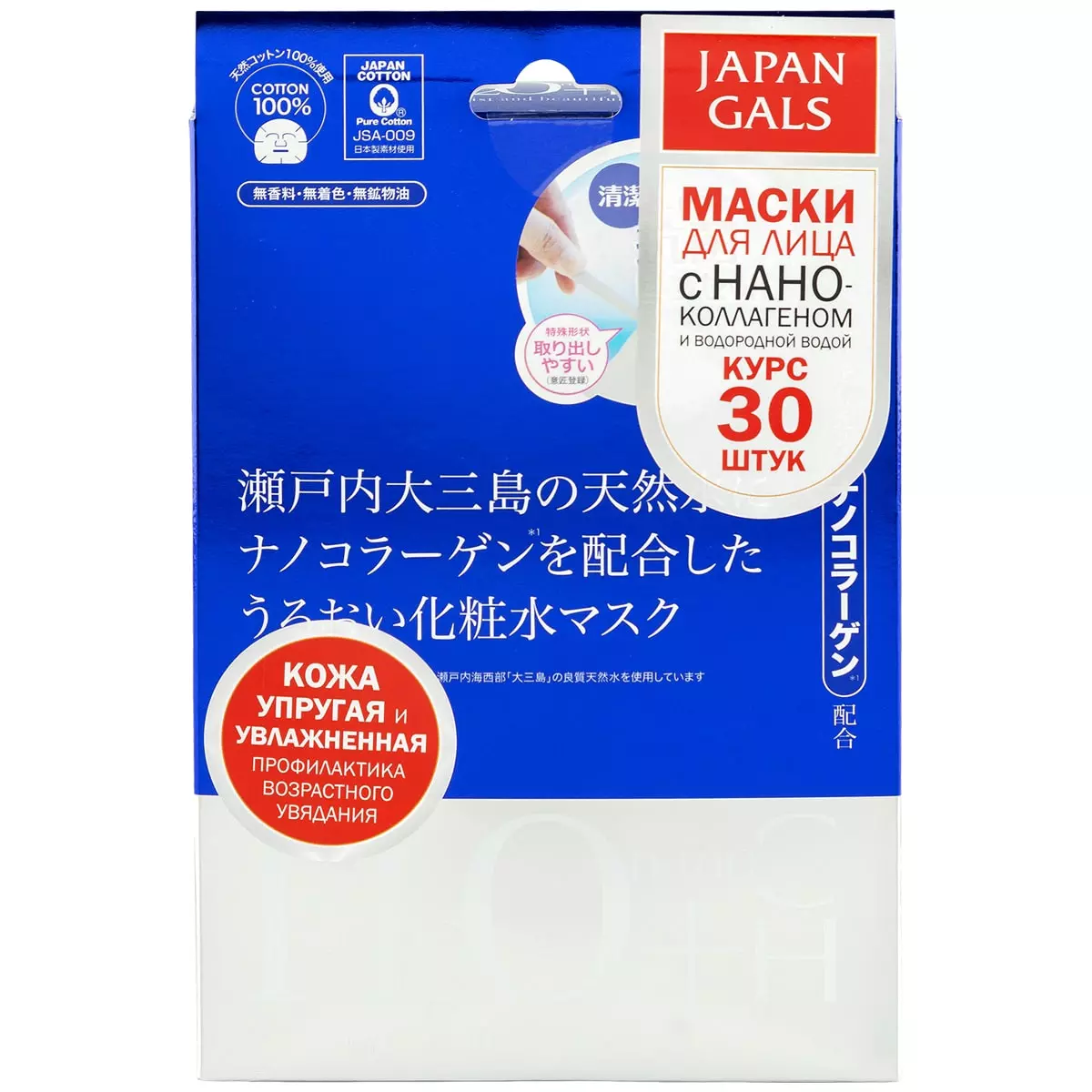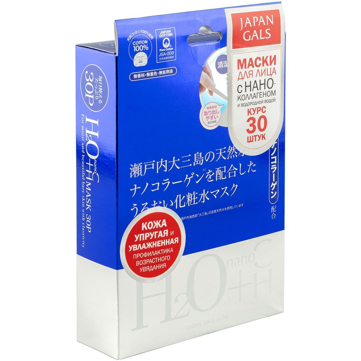 Основа антивозрастной маски изготовлена из натурального хлопка. Базовым компонентом средства являются: водородная вода (Н4О) из озера Оомисима в проливе Сэто, ионизированная вода и ферментизированная вода – этот комплекс нейтрализует активные клеточные ферменты, которые способствуют старению, и устраняют признаки увядания кожи.