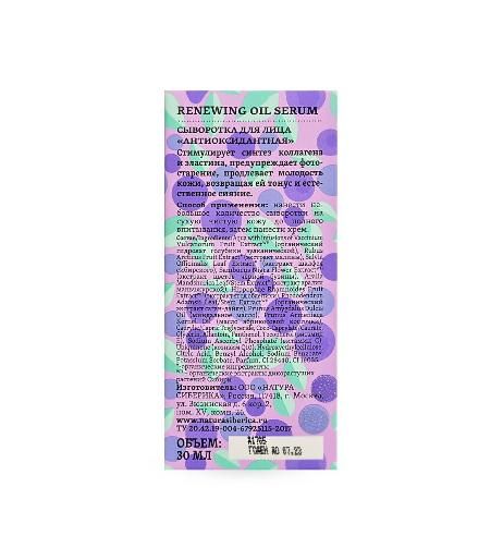 Сыворотка для лица "Антиоксидантная" стимулирует синтез коллагена и эластина, предупреждает признаки фотостарения, продлевает молодость кожи, возвращая ей тонус и естественное сияние.