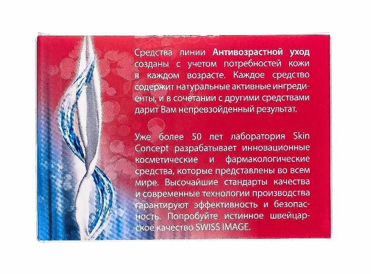 Специально с учетом потребностей кожи швейцарская лаборатория Skin Concept разработала новую марку косметики SWISS IMAGE, которая производится из натуральных биологически активных ингредиентов. Крем заботится о коже на протяжении всей ночи, восстанавливает её, избавляет от стресса и следов усталости. Инновационный экстракт снежных водорослей разглаживает первые морщины и предупреждает их появление. Уменьшает потерю эластичности волокон коллагена, сохраняет упругость и молодой вид кожи. Усиливает кровообращение и питание клеток кожи, устраняет тусклый цвет лица. Экстракт коры африканской березы нейтрализует действие свободных радикалов и защищает кожу. Натуральный комплекс, содержащийся в креме, существенно повышает уровень влаги в коже и обеспечивает оптимальный уровень питания и увлажнения на 24 часа. Восстанавливающий ночной крем не содержит PEG (полиэтиленгликоль) и парабенов.