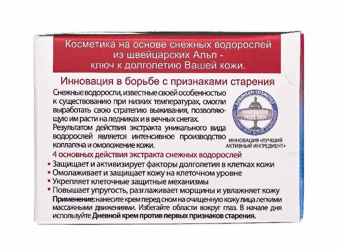 Инновация в борьбе с признаками старения. Снежные водоросли, известные своей особенностью к существованию при низких температурах, смогли выработать свою стратегию выживания, позволяющую им расти на ледниках и в вечных снегах. Результатом действия экстракта уникального вида водорослей является интенсивное производство коллагена и омоложение кожи. Кожный барьер усиливается, кожа становится более свежей, детоксифицированной, менее заметны возрастные пятна.