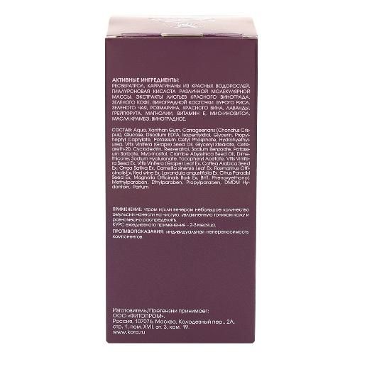 Состав: aqua, xantham gum, carrageenans (chondrus crispus), glucose, disodium edta, isopentyldiol, glycerin, propylheptyl caprylate, potassium cetyl phosphate, hydrohyethylurea, vitis vinifera (grape) seed oil, glyceryl stearate, ceteareth-20, cyclodextrin, resveratrol, sodium benzoate, potassium sorbate, myo-inositol, crambe abyssinica seed oil, dimethicone, sodium hyaluronate, tocopheryl acetate, vitis vinifera seed extract, vitis vinifera (grape) leaf extract, coffea arabica seed extract, oryza sativa extract, camellia sinensis leaf extract, rosmarinus officinalis extract, red wine extract, lavandula angustifolia extract, citrus paradisi seed extract, magnolia officinalis bark extract, xanthan gum, внт, phenoxyethanol, methylparaben, ethylparaben, propylparaben, dmdm hydantoin, parfum.