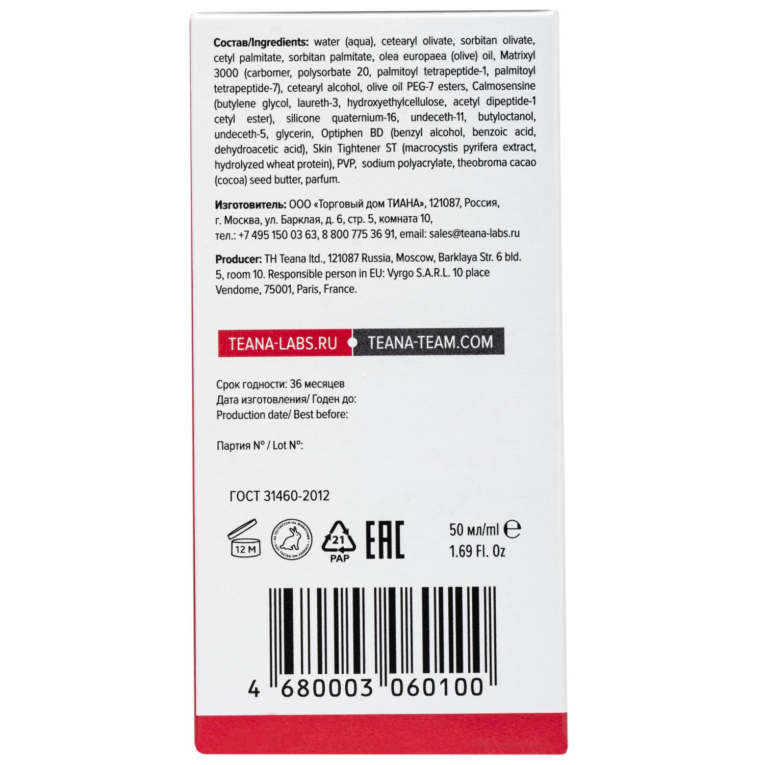 Вода, Цетеарил оливат, Сорбитан оливат, Цетил пальмитат, Сорбитан пальмитат, Масло оливковое, Calmosensine (бутиленгликоль, Вода, Лаурет-3, Гидроксиэтилглюкоза, Ацетил дипептид-1 цетиловый эфир), Matrixyl 3000 (глицерин, Бутиленгликоль, Вода, Карбомер, Полисорбат-20, Пальмитоил олигопептид, Пальмитоил тетрапептид-7), Моностеарат глицерина, Изооктил стеарат, Цетеарил этилгексаноат, ПЭГ-7 эфиры оливкового масла, Цетилстеариловый спирт, Skin Tightener ST (Вода, Глицерин, Экстракт морской бурой водоросли, Гидролизат белков пшеницы, ПВП), Диметикон, Глицерин, Масло какао, Акрилаты/С 10-30 алкил акрилат кроссполимер, Триэтаноламин, Оптифен, Парфюмерная композиция.