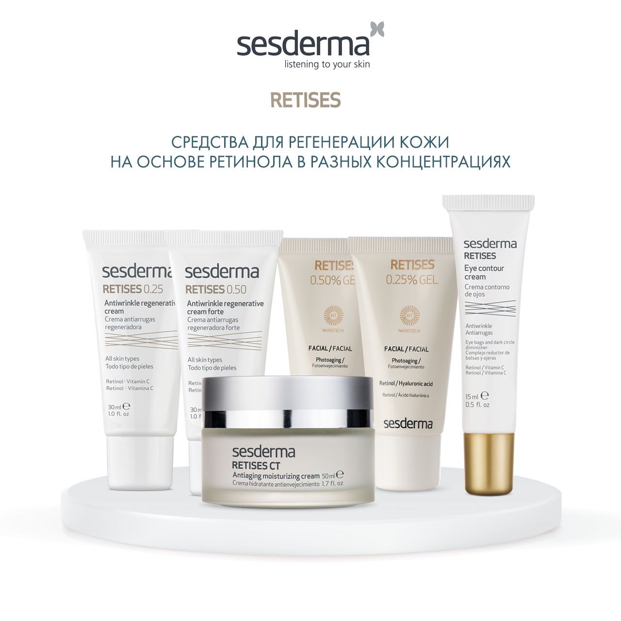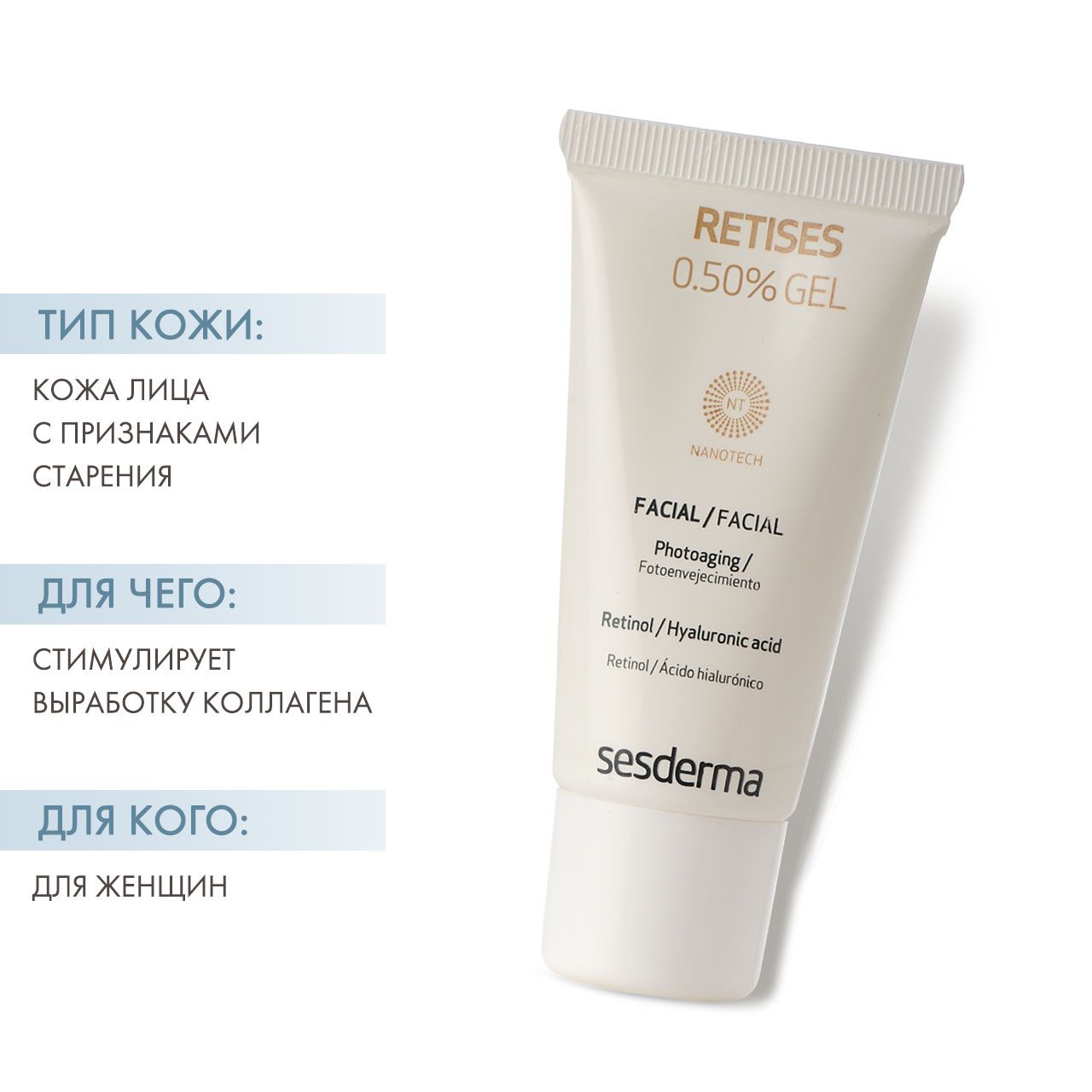 Омолаживающий гель на основе ретинола и низкомолекулярной гиалуроновой кислоты. Мгновенно увлажняет кожу, повышает ее эластичность и стимулирует выработку собственного коллагена.