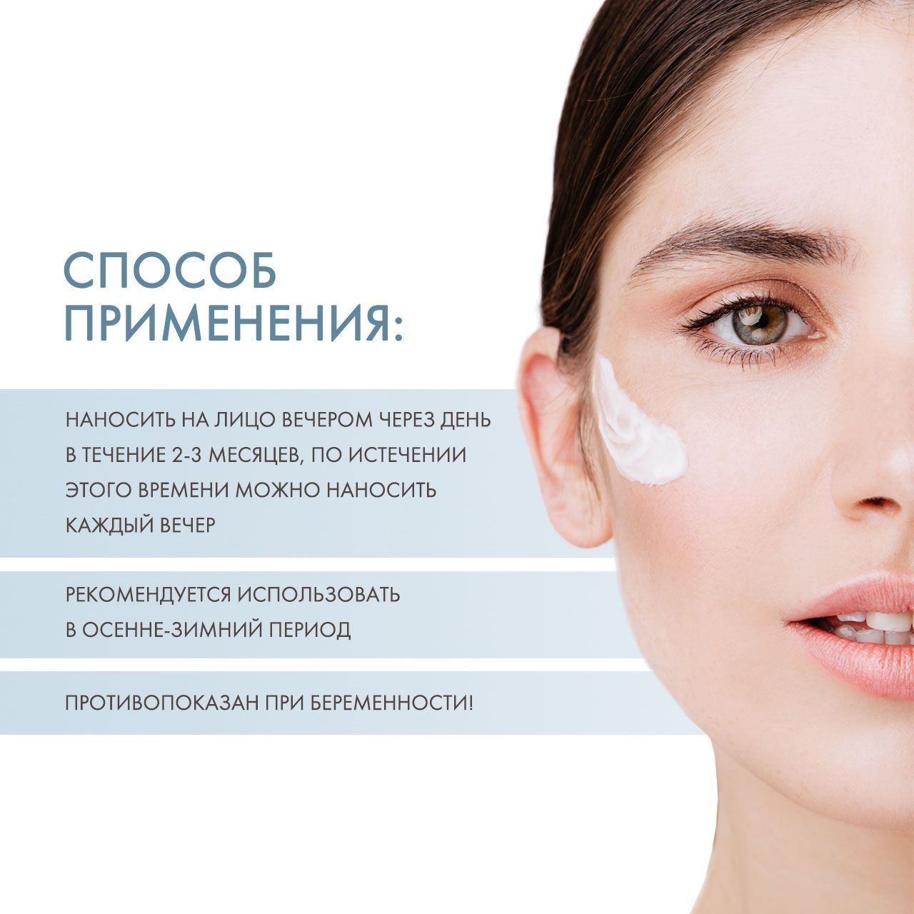 Наносить на лицо вечером через день в течение 2-3 месяцев, по истечении этого времени можно наносить каждый вечер. Рекомендуется использовать в осенне-зимний период.