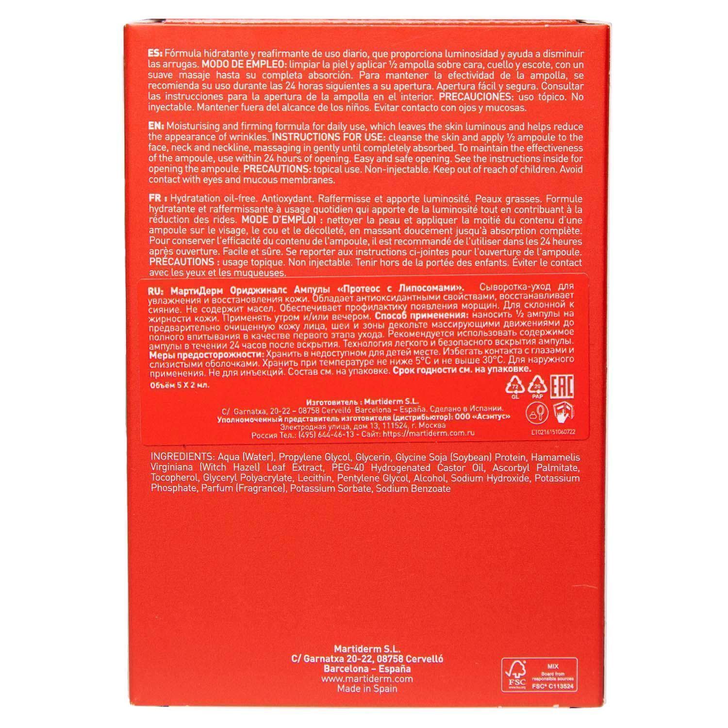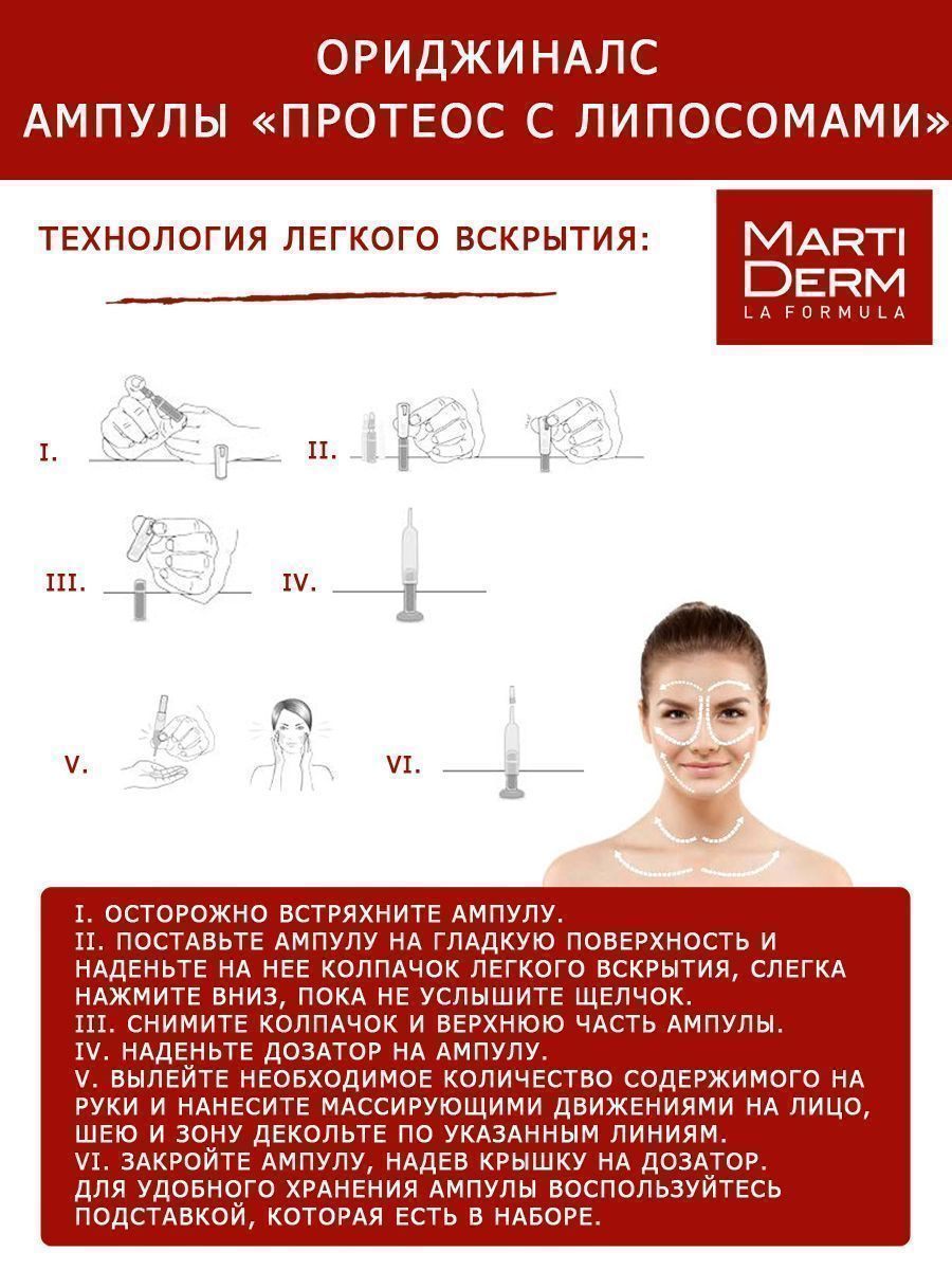 Наносите ½ Martiderm Originals Proteos Liposome на предварительно очищенную кожу лица, шеи и зону декольте массирующими движениями до полного впитывания.