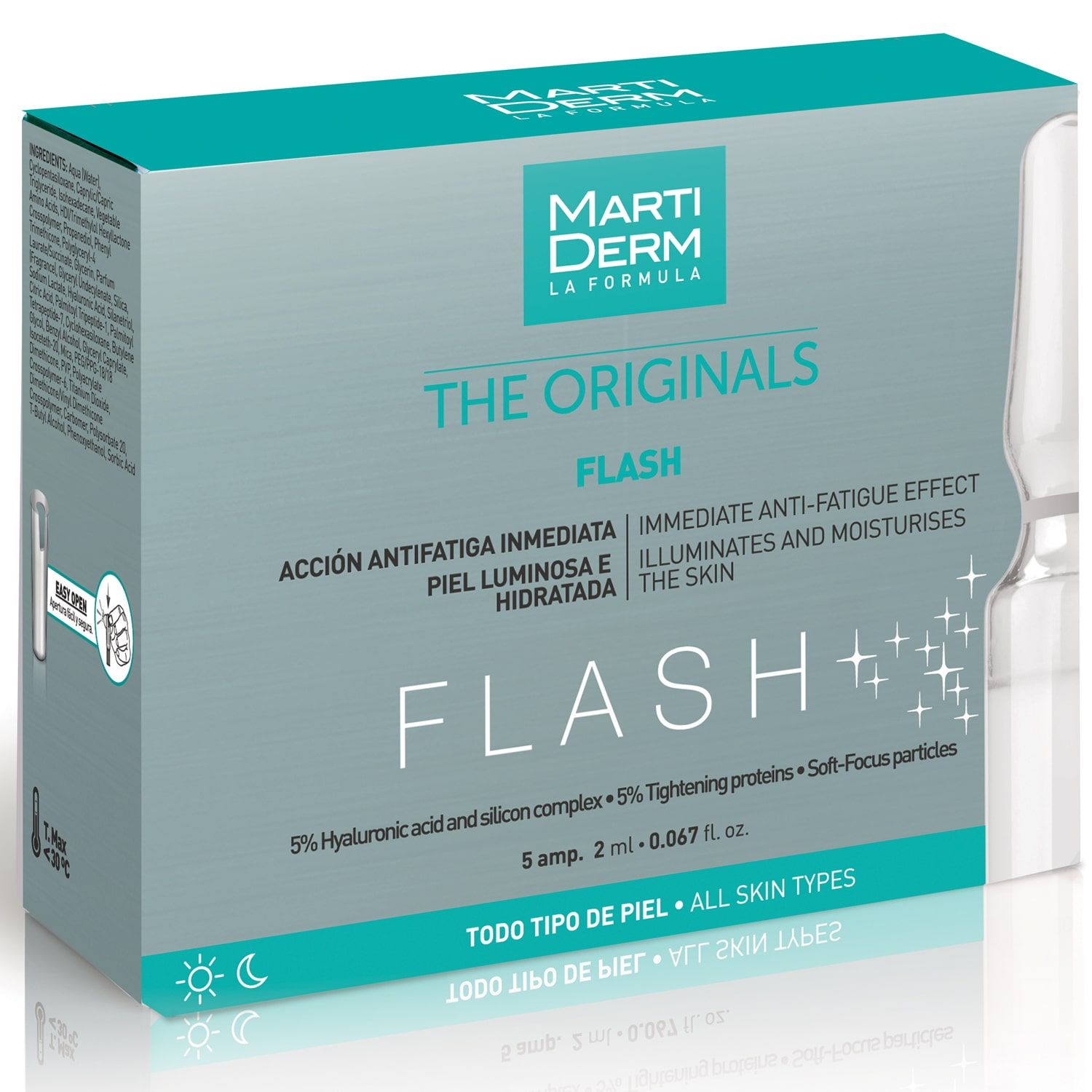 Ориджиналс Ампулы «Флэш» разработаны для всех типов кожи с признаками усталости. Это антиоксидантный и увлажняющий уход, наполняющий кожу энергией. Восстанавливает водный баланс, повышает упругость кожи, разглаживает морщины. Увлажняет кожу, восполняя недостаток влаги, устраняет признаки усталости, стирая их. Кожа приобретает свежесть и отдохнувший вид.