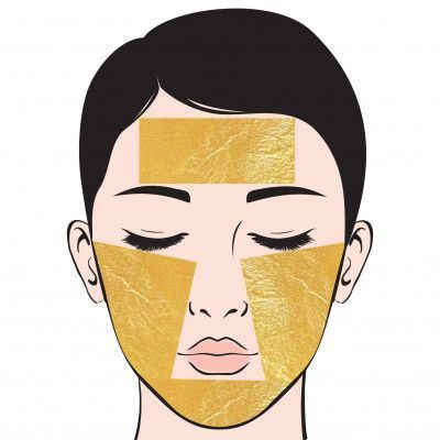 4. Нанесение золота: нанесите по одному листу золота на каждую сторону лица. Затем разделите один лист золота на три части и нанесите на лоб, нос и подбородок (10 минут)