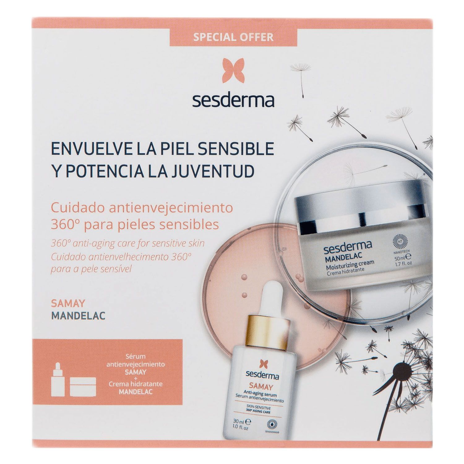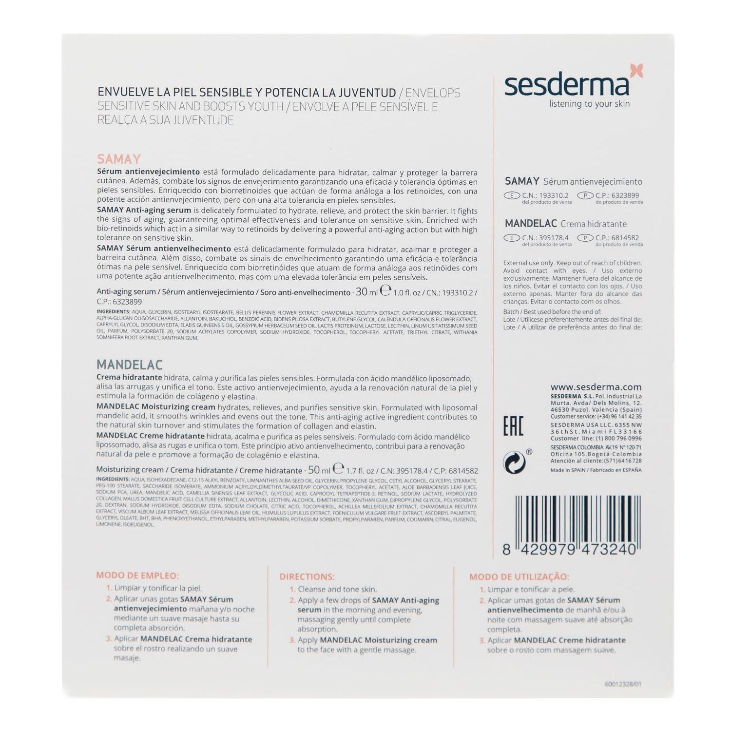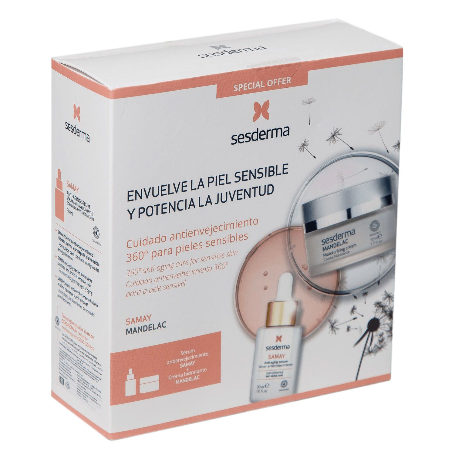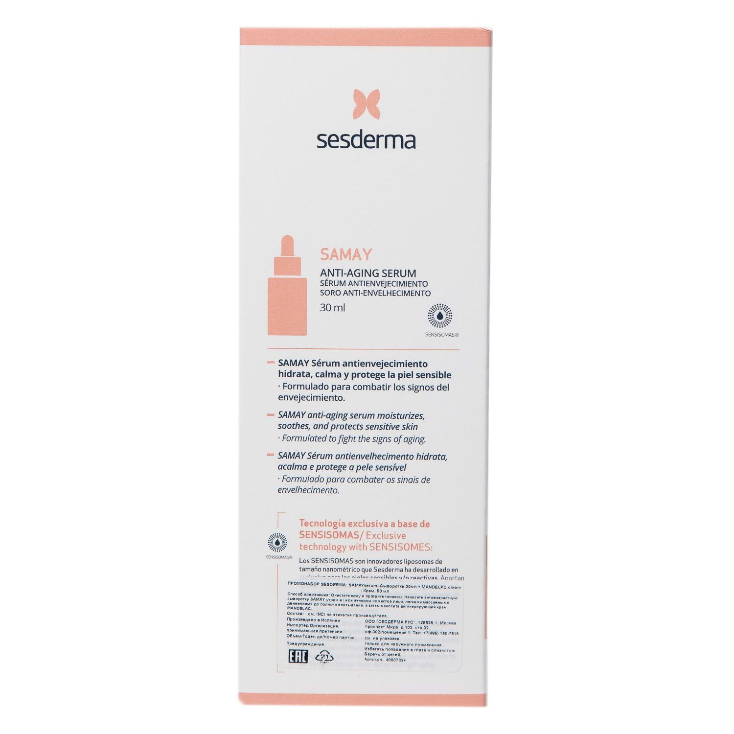 1. Сыворотка антивозрастная Samay, 30 мл: специально разработана для чувствительной кожи и кожи склонной к раздражению. В дополнение к омолаживающему действию активные вещества восстанавливают защитный барьер, увлажняют и успокаивают кожу. Уникальная формула заключена в микроскопические капсулы Sensisomas®, которые улучшают проникновение активных ингредиентов без раздражения чувствительной кожи. Средство содержит био-ретиноиды и вводится в уход постепенно, с 2-х раз в неделю до ежедневного применения.