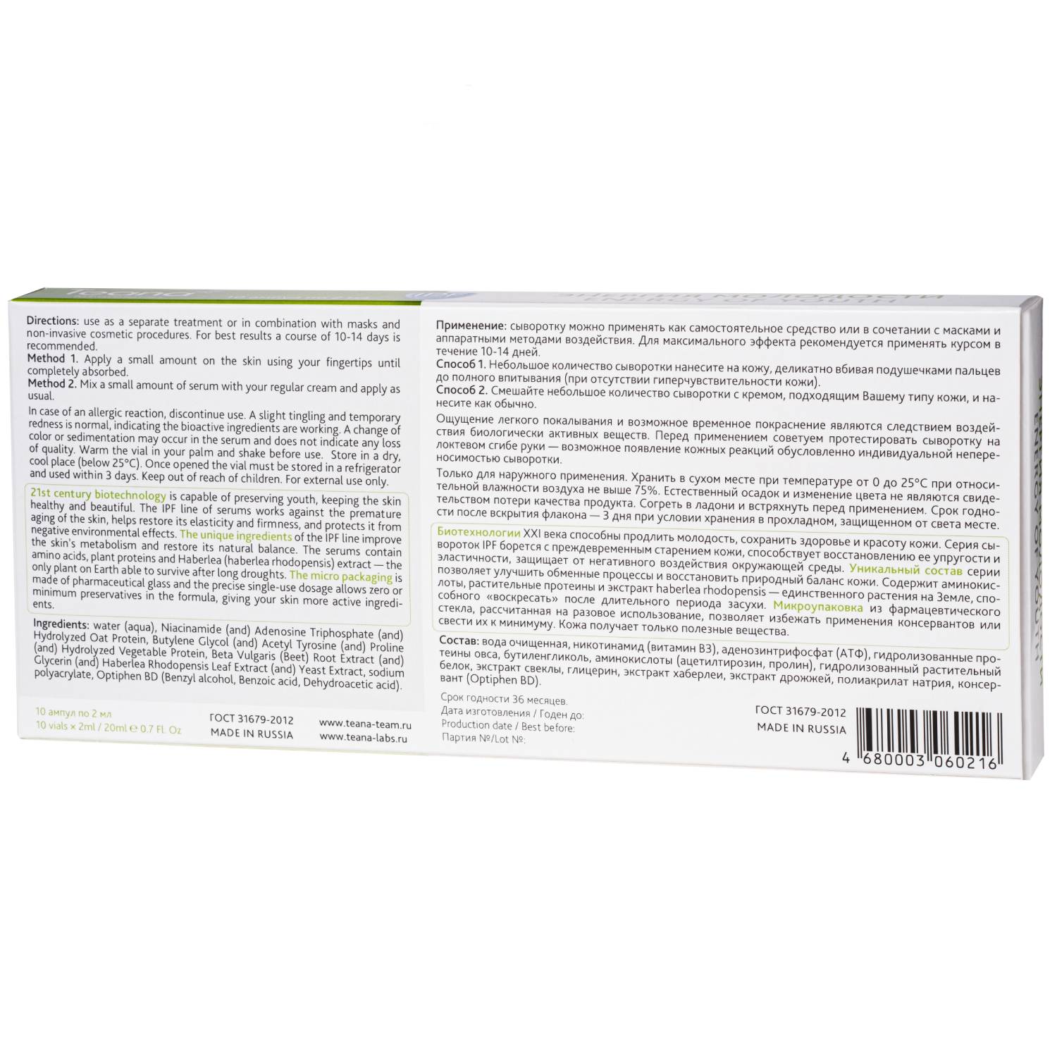 Вода очищенная, пиридоксин (витамин В6), гидролизованные протеины овса, аминокислоты (ацетилтирозин, пролин), растительный протеин, аденозинтрифосфат (АТФ), экстракт свеклы, экстракт хаберлеи, экстракт дрожжей, Covacream LCW.