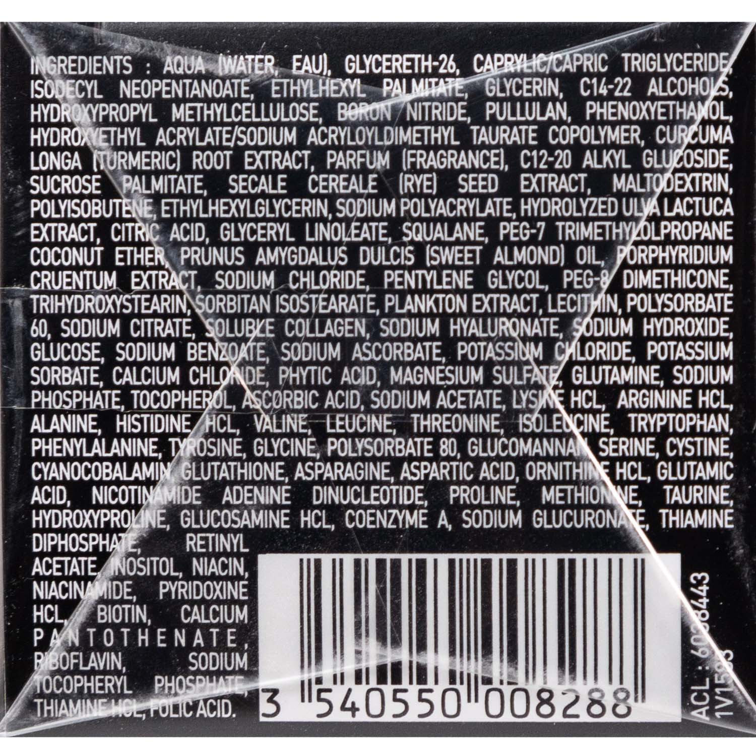Состав: aqua (water, eau), glycereth-26, caprylic/capric triglyceride, isodecyl neopentanoate, ethylhexyl palmitate, glycerin, c14-22 alcohols, hydroxypropyl methylcellulose, boron nitride, pullulan, phenoxyethanol, hydroxyethyl acrylate/sodium acryloyldimethyl taurate copolymer, curcuma longa (turmeric) root extract, parfum (fragrance), c12-20 alkyl glucoside, sucrose palmitate, secale cereale (rye) seed extract, maltodextrin, polyisobutene, ethylhexylglycerin, sodium polyacrylate, hydrolyzed ulva lactuca extract, citric acid, glyceryl linoleate, squalane, peg-7 trimethylolpropane coconut ether, prunus amygdalus dulcis (sweet almond) oil, porphyridium cruentum extract, sodium chloride, pentylene glycol, peg-8 dimethicone, trihydroxystearin, sorbitan isostearate, plankton extract, lecithin, polysorbate 60, sodium citrate, soluble collagen, sodium hyaluronate, sodium hydroxide, glucose, sodium benzoate, sodium ascorbate, potassium chloride, potassium sorbate, calcium chloride, phytic acid, magnesium sulfate, glutamine, sodium phosphate, tocopherol, ascorbic acid, sodium acetate, lysine hcl, arginine hcl, alanine, histidine hcl, valine, leucine, threonine, isoleucine, tryptophan, phenylalanine, tyrosine, glycine, polysorbate 80, glucomannan, serine, cystine, cyanocobalamin, glutathione, asparagine, aspartic acid, ornithine hcl, glutamic acid, nicotinamide adenine dinucleotide, proline, methionine, taurine, hydroxyproline, glucosamine hcl, coenzyme a, sodium glucuronate, thiamine diphosphate, retinyl acetate, inositol, niacin, niacinamide, pyridoxine hcl, biotin, calcium pantothenate, riboflavin, sodium tocopheryl phosphate, thiamine hcl, folic acid