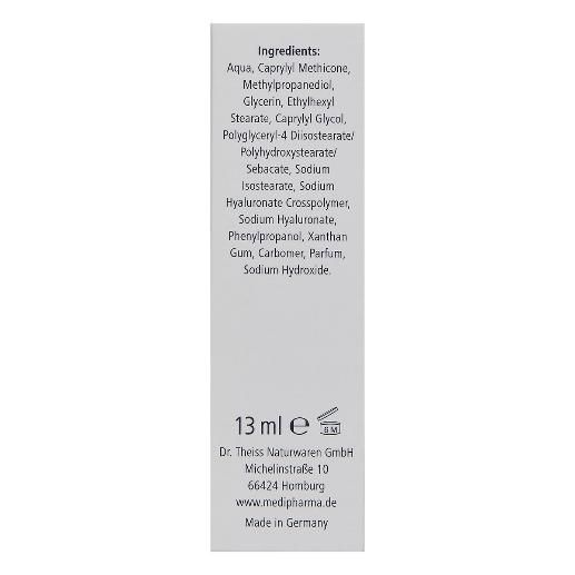 Aqua, Caprylyl Methicone, Methylpropanediol, Glycerin, Ethylhexyl Stearate, Caprylyl Glycol, Polyglyceryl-4 Diisostearate/Polyhydroxystearate/Sebacate, Sodium Isostearate, Sodium Hyaluronate Crosspolymer, Sodium Hyaluronate, Phenylpropanol, Xanthan Gum, Carbomer, Parfum, Citric Acid, Linalool, Citronellol, Butylphenyl Methylpropional, Geraniol.