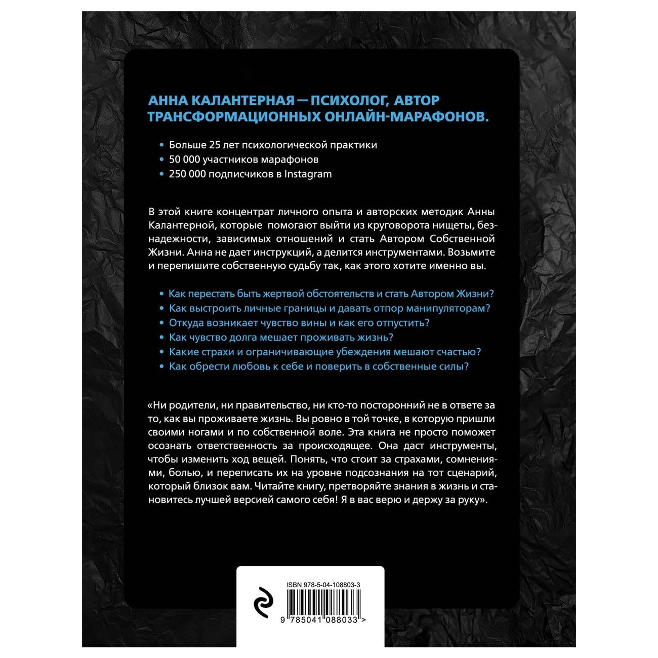 Анна Калантерная — психолог, основательница Международной Тренинг-студии онлайн-марафонов личностного роста (Автор и ведущая семи марафонов: «Автор Жизни», «Автор Жизни-2», «Ключ к себе», «Матрица Стройности», «Матрица Стройности Sport Edition», «Финансовый ключ», «Жизнь без чувства вины». Соавтор марафонов «Ключ к ребенку», «Расширение финансового сознания».