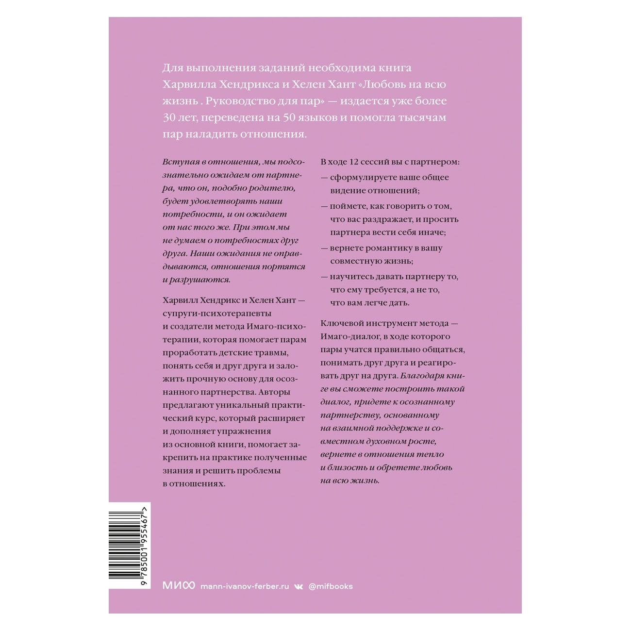 Воркбук к бестселлеру "Любовь на всю жизнь. Руководство для пар". 12 сессий, которые помогут укрепить отношения. Более 30 лет назад известный психотерапевт Харвилл Хендрикс в соавторстве с женой Хелен Хант написали прекрасную книгу о том, как сохранить любовь и близость в отношениях с помощью авторского метода — терапии Имаго. Книга быстро стала бестселлером и помогла многим парам, переживающим кризисный период, понять причины их проблем и создать по-настоящему близкие и глубокие отношения. Это руководство поможет закрепить на практике информацию, полученную в книге: вы пройдете 12-недельный курс упражнений и закрепите навыки общения и взаимодействия с партнером, необходимые для любви и гармоничной связи. Для кого эта книга: Для пар, которые не удовлетворены своими отношениями, имеют трудности и проблемы. Для пар, которые стремятся к устойчивому и счастливому партнерству.