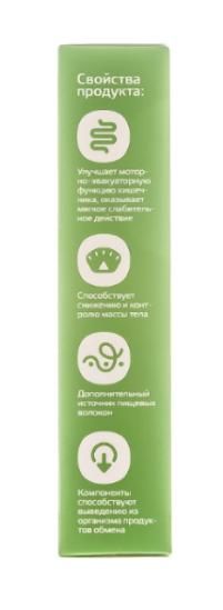Продукт диетического питания является дополнительным источником пищевых волокон. Предназначен для улучшения моторно-эвакуаторной функции кишечника для людей, склонных к запорам, а также для лиц, контролирующих массу тела.