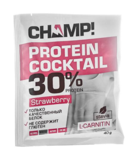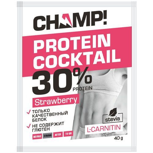 В составе нового клубничного протеинового коктейля Champ содержится только качественный молочный протеин, сывороточный белок, казеин, пребиотики, декстроза, стевия, L-карнитин, пищевые волокна. Незаменим для тех, кто ведет активный образ жизни, отличный вариант полезного перекуса с насыщенным клубничным вкусом. Не содержит глютен, также без добавления красителей и консервантов. Удовольствие с пользой для фигуры!
