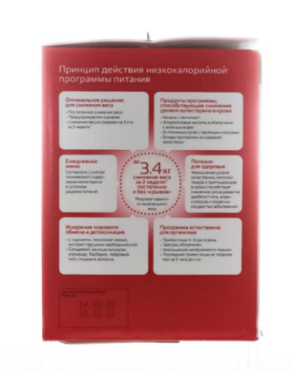 В процессе похудения важно ограничивать калорийность рациона (не более 1200 ккал сутки с учетом дополнительного питания). Программа питания «Снижение веса и Холестерина» дает возможность строгого контроля приема пищи – специалистами максимально точно подсчитана калорийность каждого блюда. Состав рациона сбалансирован по белкам и углеводам, с ограничением содержания жиров.