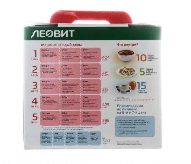 Первые блюда: суп-пюре гороховый с сухариками, суп-пюре со злаками и шпинатом, суп с капустой и шпинатом, суп-пюре со злаками и вишней, борщ украинский постный витаминизированный, суп-пюре со злаками и малиной, суп итальянский грибной, суп-пюре со злаками и тыквой, суп-пюре из помидоров по-тоскански, суп-пюре со злаками и яблоком. Вторые блюда: рис с грибами и овощами, ризотто с рыбой, пюре картофельное с шампиньонами, гречка по-малороссийски, картофель с овощами и зеленью Напитки: Капуччино «Кофе для похудения (жиросжигающий комплекс)» с зеленым кофе, чай «(очищающий комплекс)», кисель «Абрикос» с пектином витаминизированный.