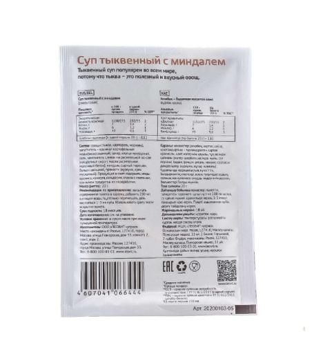 Овощи (тыква, картофель, морковь), крахмал картофельный, сахар, хлопья кукурузные, соль поваренная, заменитель сливок на растительной основе (кукурузный сироп, масло растительное, молочный белок), миндаль, сырный порошок, бульон овощной, пряности (куркума, орех мускатный).