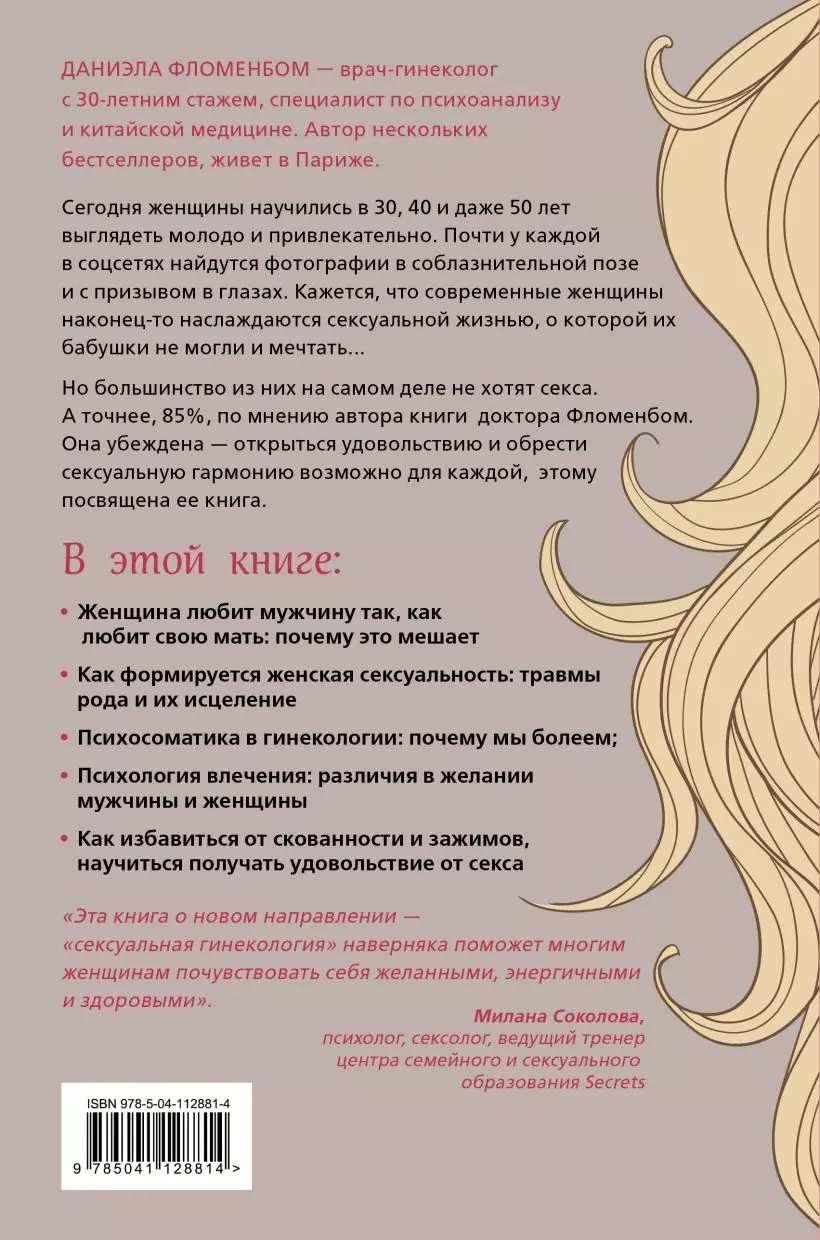 Врач-гинеколог Даниэла Фломенбом, опираясь на свой тридцатилетний опыт, объясняет, как формируется женская сексуальность. Как мать и весь женский род влияют на либидо женщины. Рассказывает о психосоматике женских болезней. Автор наглядно разбирает проблемы своих пациенток и путь обретения ими сексуальной гармонии. Используя знания в психологии, гинекологии и китайской медицине, Даниэла дает практичные советы о том, как разобраться в себе, понять истинные причины неудовлетворенности и начать по-настоящему наслаждаться сексом, ведь наше тело создано для этого.