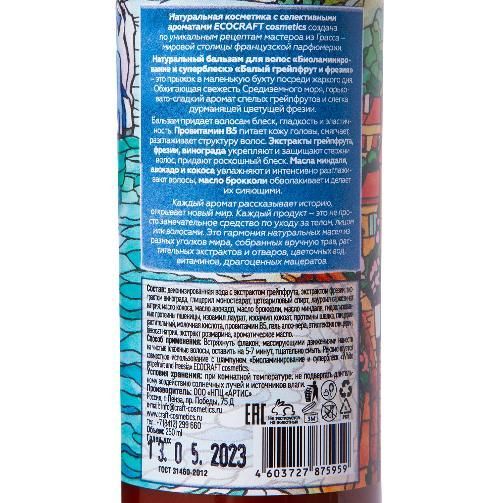Бальзам придает волосам блеск гладкость и эластичность. Провитамин В5 питает кожу головы, смягчает, разглаживает структуру волос. Экстракты грейпфрута, фрезии, винограда укрепляют и защищают стержни волос, придают роскошный блес. Масла минадаля, авокадо и кокоса увлажняют и интенсивно разглаживают волосы. Масло брокколи обволакивает и делает их сияющими. Аромат «Белый грейпфрут и фрезия» - это прыжок в маленькую бухту посреди жаркого дня. Обжигающая свежесть Средиземного моря, горьковато-сладкий аромат спелых грейпфрутов и слегка дурманящей цветущей фрезии.