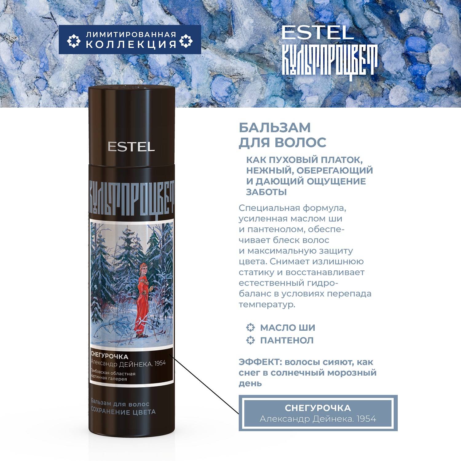 Культпроцвет – специальный проект Estel в сотрудничестве с музеями России, предоставившими репродукции великих картин для погружения в мир искусства и зимних чудес. Идея соединяет магию образа Снегурочки, силу искусства и современные формулы для ухода за волосами.