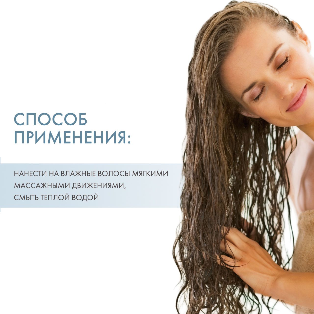 Нанести на влажные волосы мягкими массажными движениями, смыть теплой водой, повторить при необходимости
