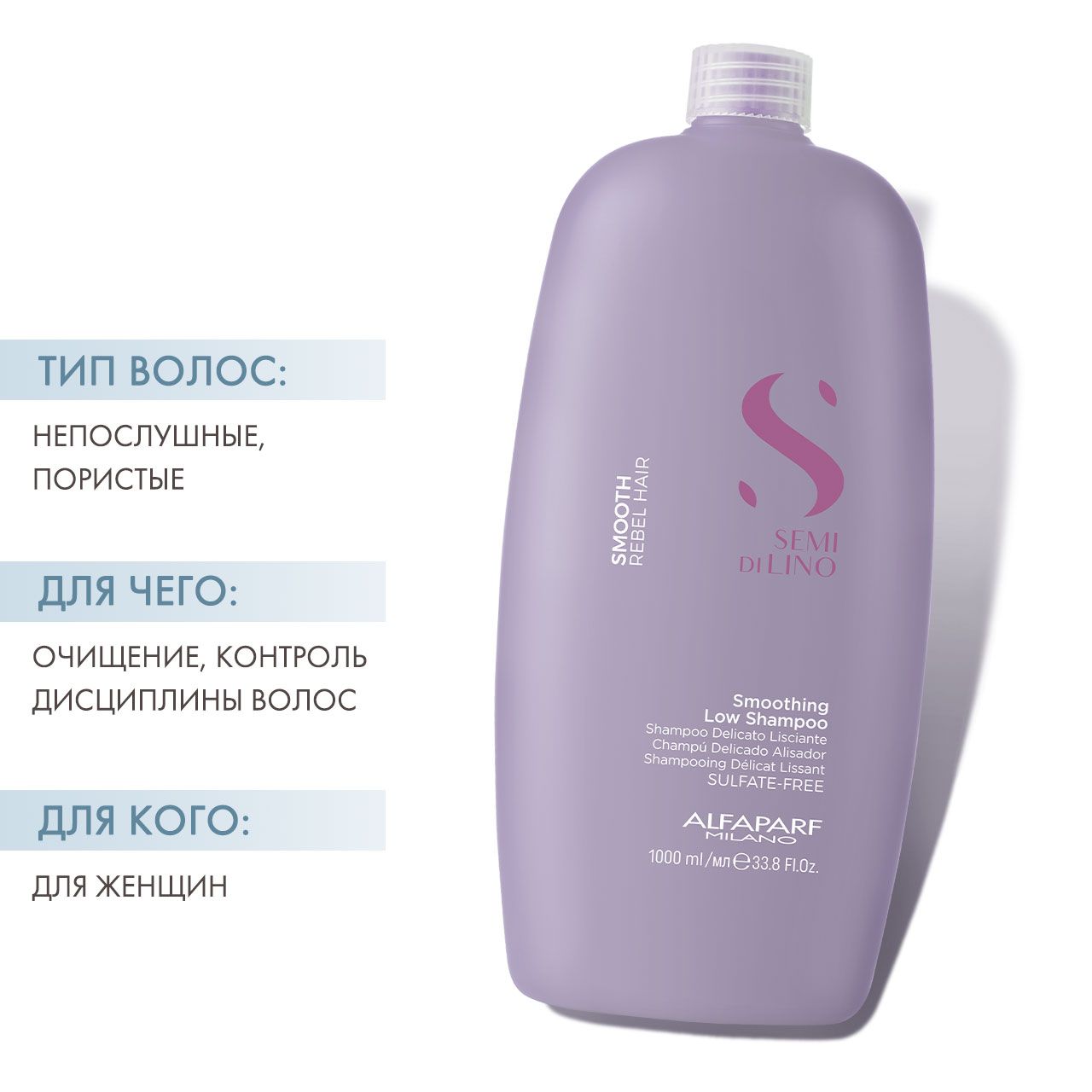 Это бессульфатный шампунь . Отлично ухаживает за длиной волос и придает блеск, мягкость. Консистенция хорошая, приятный аромат, заявленный эффект есть, НО ни один шампунь, особо не уберет пушистость без маски. Рекомендую и маску в тандеме , волосы шикарные . Большой объем по супер цене .