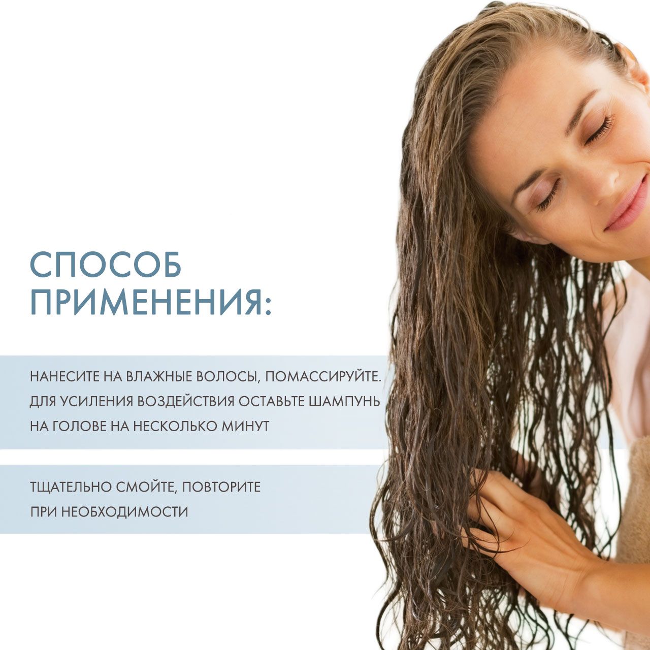 Нанесите на влажные волосы, помассируйте. Для усиления воздействия оставьте шампунь на голове на несколько минут. Тщательно смойте, повторите при необходимости