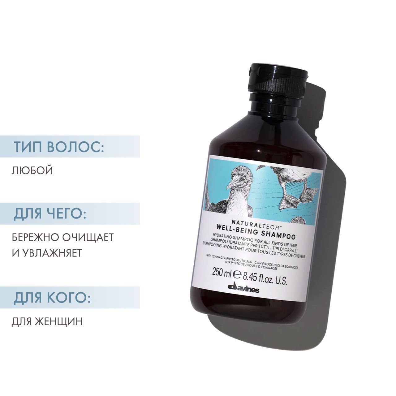 Увлажняющий шампунь бережно очищает волосы и кожу головы. Подходит для любого типа волос.