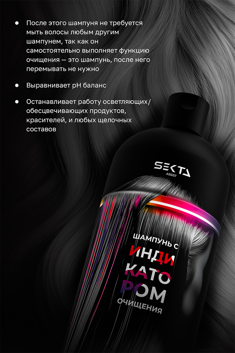 Шампунь с индикатором очищения меняет цвет при контакте с осветляющими, обесцвечивающими средствами, красителями и другими щелочными составами. Шампунь имеет оранжевый оттенок и не содержит тонирующих пигментов. Если на волосах есть остатки кислых или щелочных средств, шампунь меняет цвет на красный, розовый или фиолетовый. Оранжевый цвет шампуня не остаётся на волосах после смывания. Он не окрашивает волосы и не изменяет цвет окрашенных прядей.