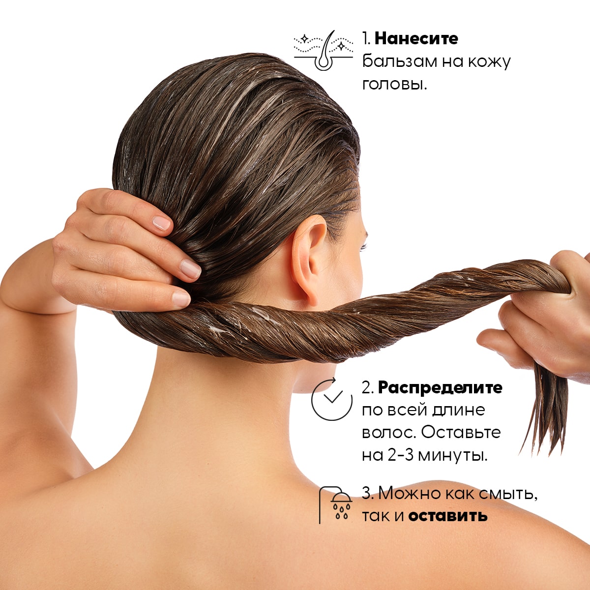 Нанесите бальзам на кожу головы и распределите по всей длине волос. Оставьте на 2-3 минуты. Можно как смыть, так и оставить.