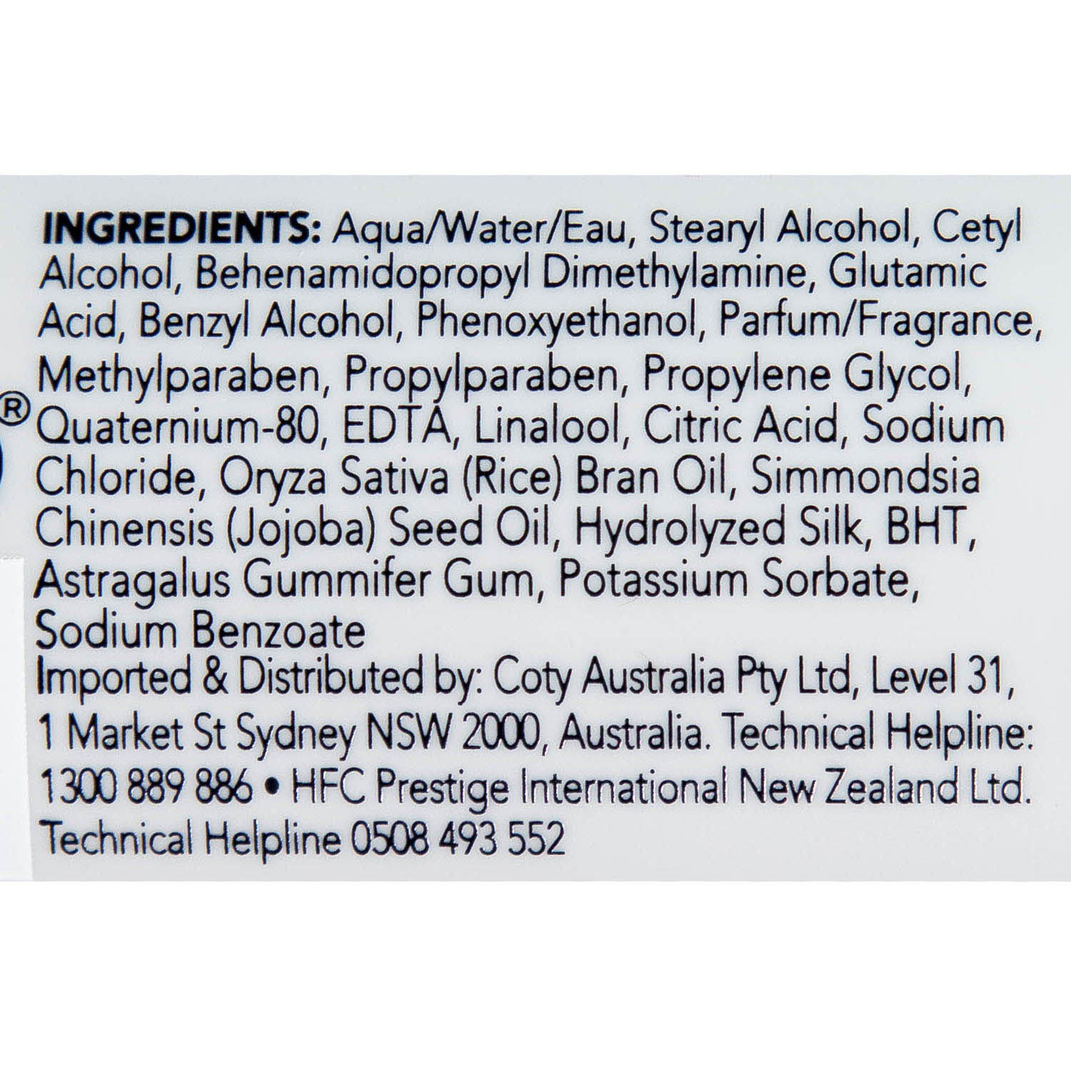 Состав: water/aqua/eau, stearyl alcohol, cetyl alcohol, behenamidopropyl dimethylamine, glutamic acid, benzyl alcohol, phenoxyethanol, bis-aminopropyl dimethicone, fragrance/parfum, methylparaben, propylparaben, edta, linalool, sodium chloride, citric acid, butylphenyl methylpropional, cyclomethicone, hydroxyisohexyl 3-cyclohexene carboxaldehyde, hydrolyzed silk, oryza sativa (rice) bran oil, simmondsia chinensis (jojoba) seed oil, cyclotetrasiloxane, propylene glycol, astragalus gummifer gum