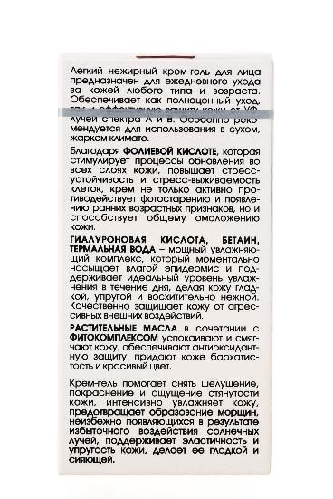 Легкий нежирный крем-гель для лица обеспечивает интенсивное увлажнение в течение всего дня и надежную защиту от широкого спектра лучей UVA/UVB. Подходит для любого типа кожи и возраста.