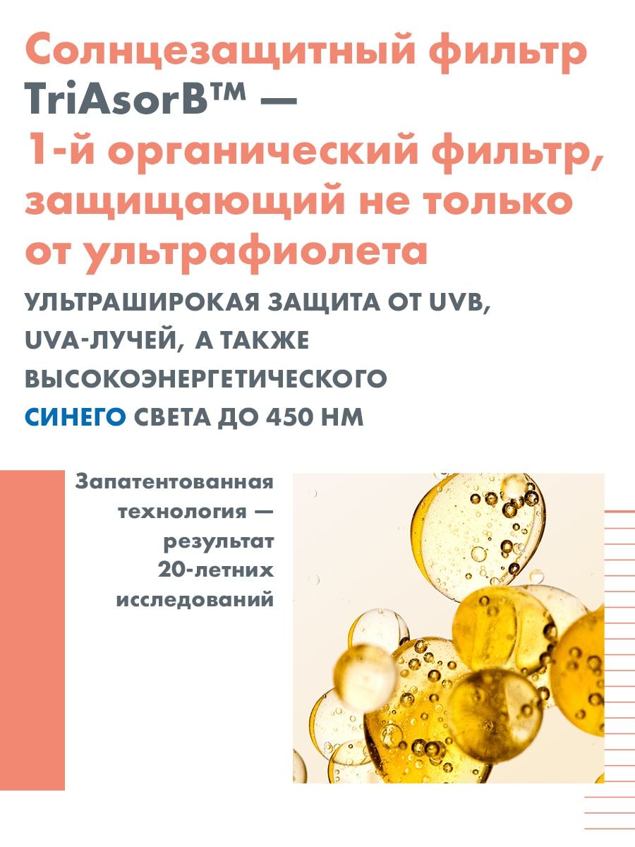 Солнцезащитный крем представлен в универсальном оттенке. Подстраивается под тон кожи, выравнивая его и обеспечивая естественный финиш. Обеспечивает очень высокую степень защиты от УФ-излучения и синего света. Позволяет снизить повреждение клеток солнечным излучением на 95%.