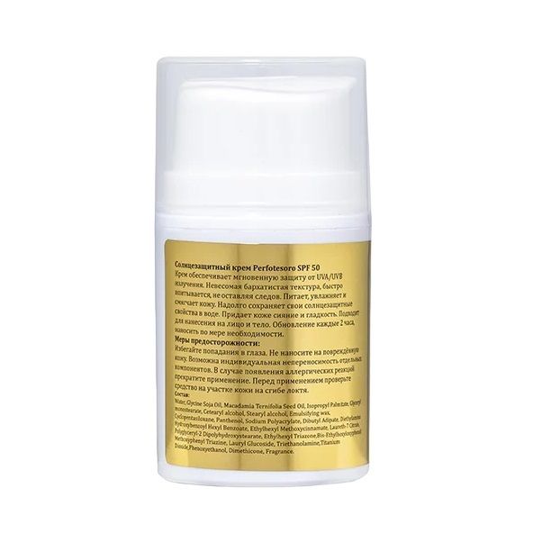 Солнцезащитный крем от Perfotesoro обеспечивает мгновенную защиту от UVA/UVB излучения. Невесомая бархатистая текстура быстро впитывается, не оставляя следов. Питает, увлажняет и смягчает кожу. Надолго сохраняет свои солнцезащитные свойства в воде. Придает коже сияние и гладкость. Подходит для нанесения на лицо и тело.
