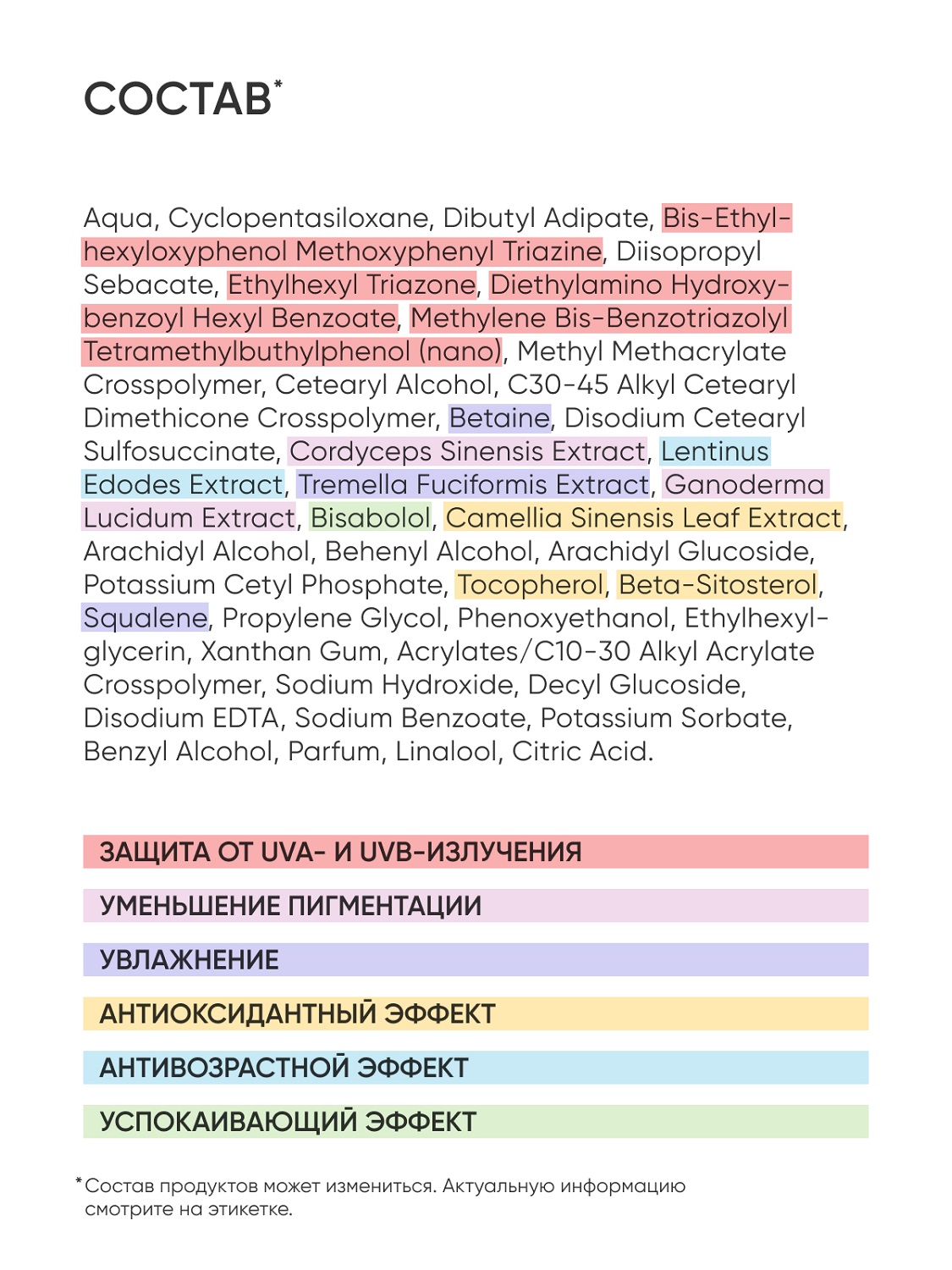 Состав: Aqua, Cyclopentasiloxane, Dibutyl Adipate, Bis-Ethylhexyloxyphenol Methoxyphenyl Triazine, Diisopropyl Sebacate, Ethylhexyl Triazone, Diethylamino Hydroxybenzoyl Hexyl Benzoate, Methylene Bis-Benzotriazolyl Tetramethylbuthylphenol (nano), Methyl Methacrylate Crosspolymer, Cetearyl Alcohol, C30-45 Alkyl Cetearyl Dimethicone Crosspolymer, Betaine, Disodium Cetearyl Sulfosuccinate, Cordyceps Sinensis Extract, Lentinus Edodes Extract, Tremella Fuciformis Extract, Ganoderma Lucidum Extract, Bisabolol, Camellia Sinensis (Green Tea) Leaf Extract, Arachidyl Alcohol, Behenyl Alcohol, Arachidyl Glucoside, Potassium Cetyl Phosphate, Tocopherol, Beta-Sitosterol, Squalene, Propylene Glycol, Phenoxyethanol, Ethylhexylglycerin, Xanthan Gum, Acrylates/C10-30 Alkyl Acrylate Crosspolymer, Sodium Hydroxide, Decyl Glucoside, Disodium EDTA, Sodium Benzoate, Potassium Sorbate, Benzyl Alcohol, Parfum, Linalool, Citric Acid.