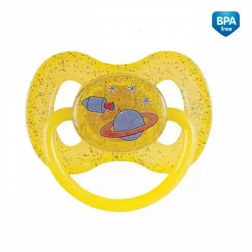 Соска пустышки имеет классическую круглую форму. Благодаря специальным отверстиям на нагубнике она отлично вентилируется, что предотвращает риск возникновения покраснений и раздражения на нежной коже малыша. Кольцо пустышки светится в темноте, благодаря чему пустышку легко найти ночью, не боясь разбудить малыша.