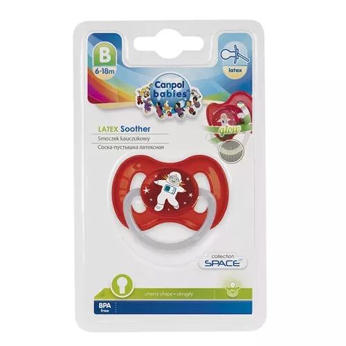 Пустышка круглая латексная "Space" изготовлена из высококачественного натурального латекса - она очень мягкая и приятная для ребенка, при этом не слипается во время использования.