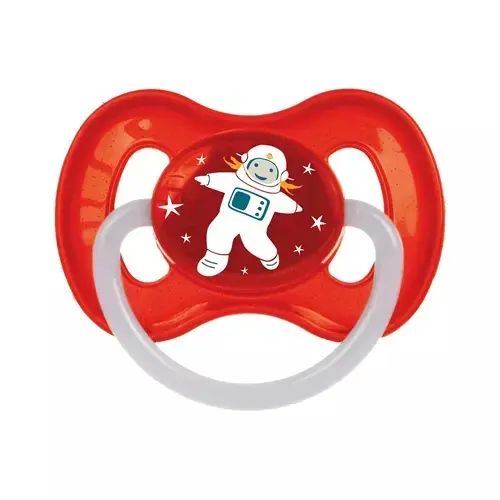 Соска пустышки имеет классическую круглую форму. Благодаря специальным отверстиям на нагубнике она отлично вентилируется, что предотвращает риск возникновения покраснений и раздражения на нежной коже малыша. Кольцо пустышки светится в темноте, благодаря чему пустышку легко найти ночью, не боясь разбудить малыша.