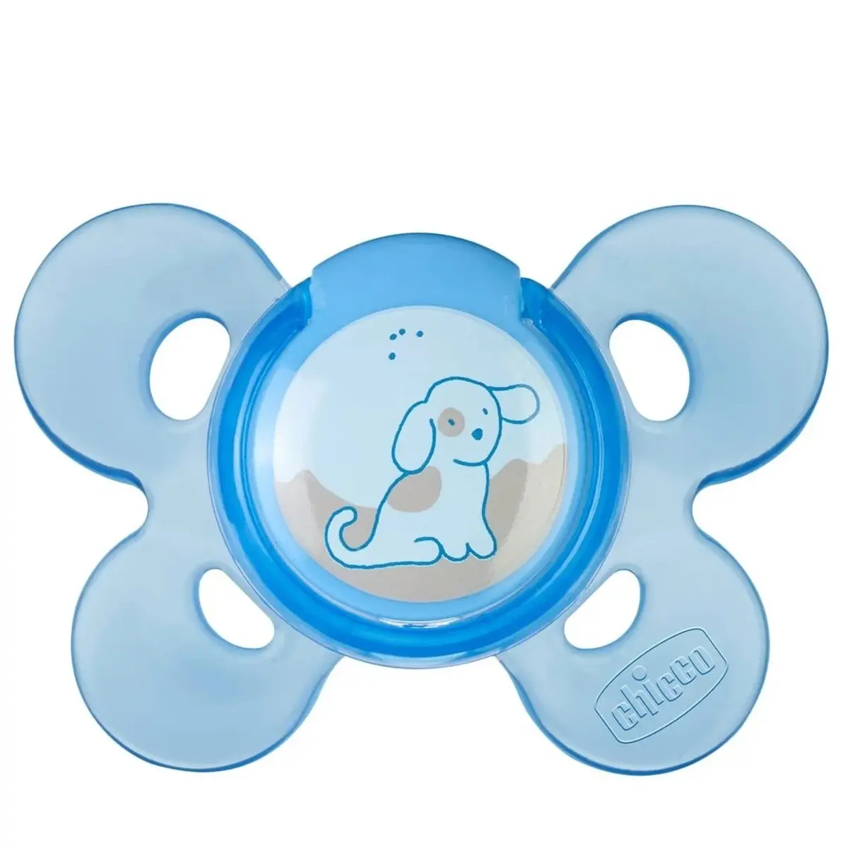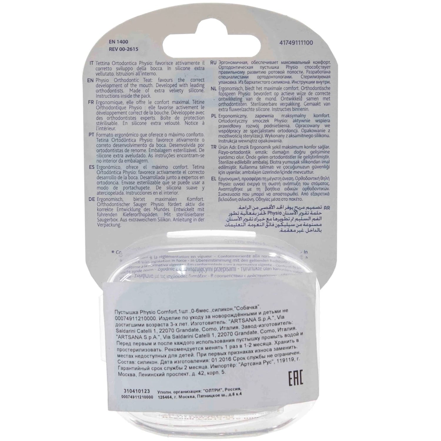 Конструкция пустышки соприкасается с лицом ребенка в 4-х точках, позволяя губам естественно двигаться во время сосания, а также оставляет свободное пространство в зоне носа и подбородка, облегчая дыхание. Ультратонкое основание соски пустышки обеспечивает естественное закрытие рта. Пустышку можно закрепить на клипсе через специальное кольцо.