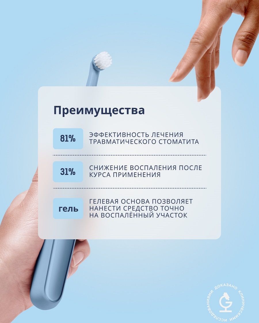• Оказывает успокаивающее воздействие на ткани, уменьшает чувствительность десен;