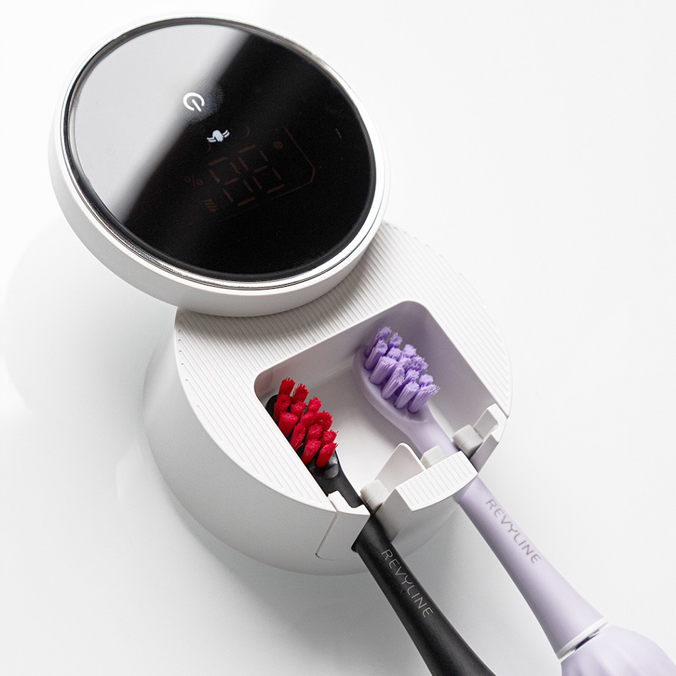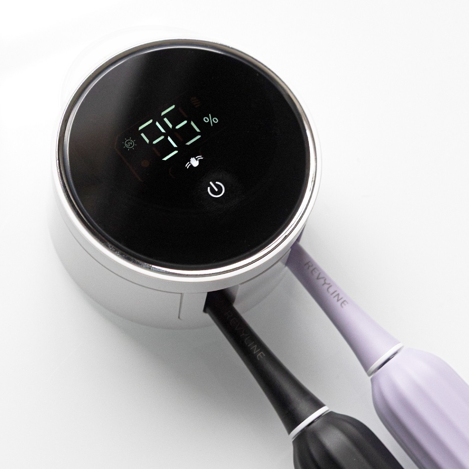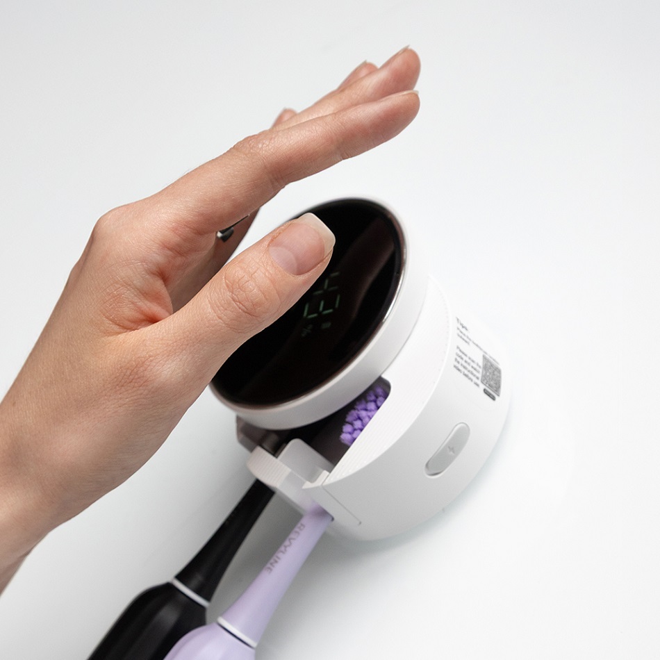 Revyline RL 01 обладает сенсорными функциями: если на расстоянии 5–7 см от экрана провести рукой - среагирует датчик и откроется крышка. При повторном движении (после того как вы поместили щетку или станок внутрь) крышка закроется.