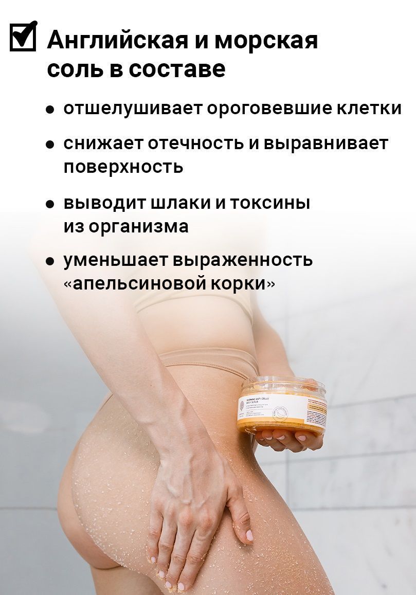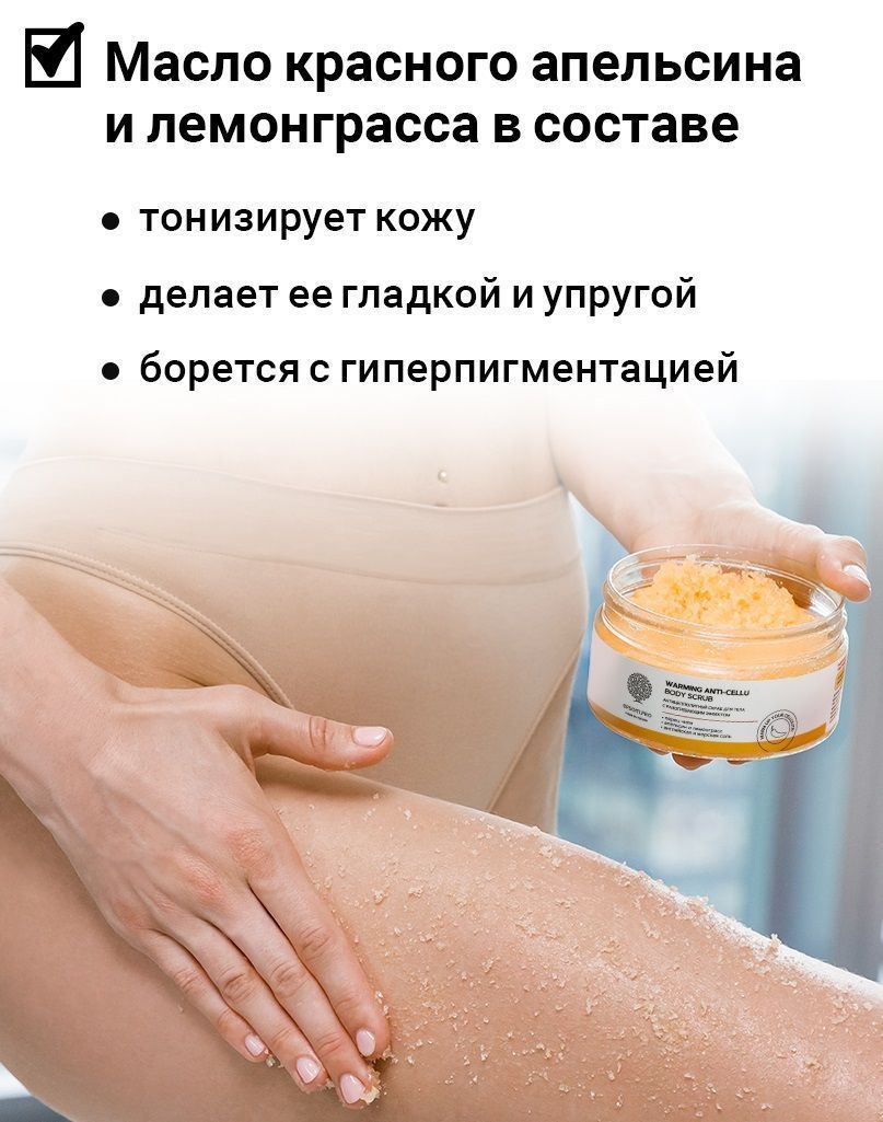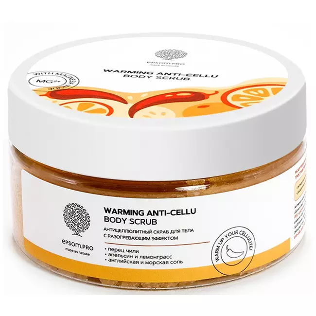 Пламенный привет целлюлиту и лишнему весу! Разогревающий безводный скраб основе магнезии и морской соли расщепляет жировые отложения, прогревает каждый слой кожи и растапливает жир. Пока вы чувствуете приятное тепло и глубокий массаж, скраб выводит лишнюю воду, убирает отечность и выравнивает кожу. Результат - идеальная гладкость, четкие формы и никакой апельсиновой корки! В процессе применения текстура скраба превращается в крем, который глубоко питает кожу, обеспечивая её мягкость и упругость. Тростниковый сахар и морская соль отшелушивают ороговевшие клетки кожи и выравнивают её рельеф. Соль оказывает омолаживающее действие, очищает организм от токсинов и нормализует водно-солевой баланс.